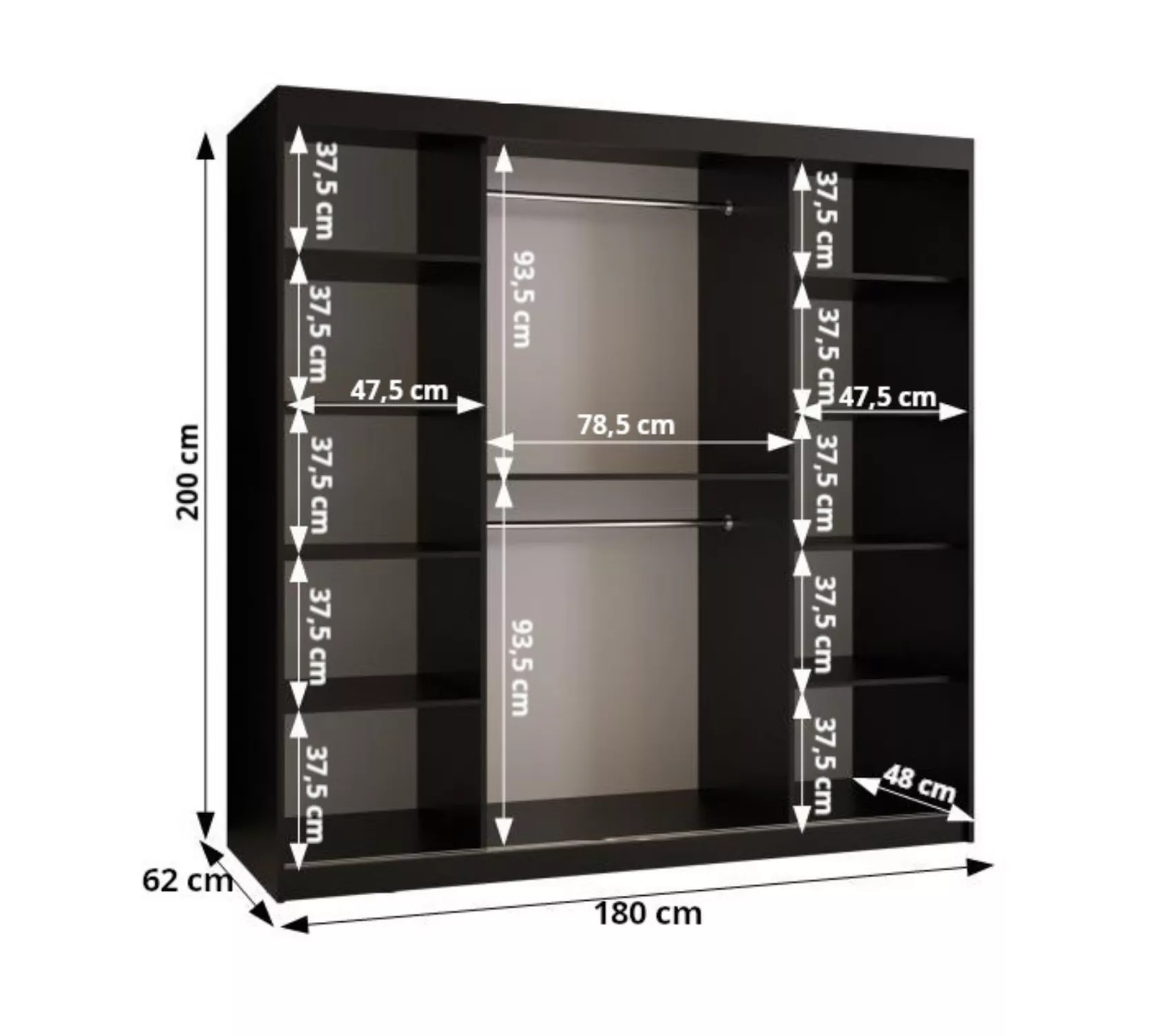 Zrcadlová šatní skříň 180 cm CASANDRA díky svému jednoduchému designu zapadne do všech ložnic. Skříň disponuje 2 šatními tyčemi a 9 prostornými policemi. Je vyrobená z odolných materiálů, díky čemuž vám bude sloužit mnoho let.