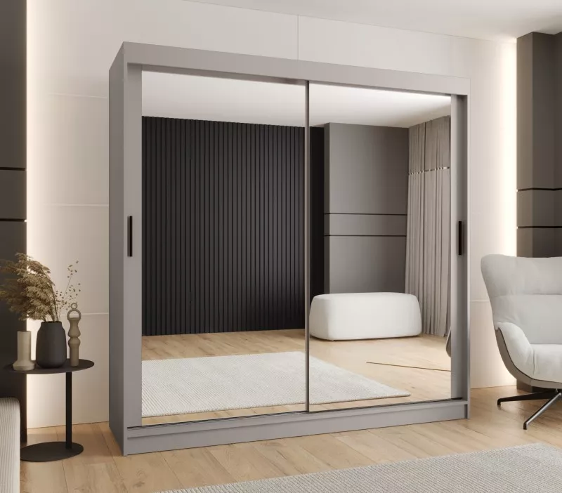 Zrcadlová šatní skříň 200 cm CASANDRA díky svému jednoduchému designu zapadne do všech ložnic. Skříň disponuje 2 šatními tyčemi a 9 prostornými policemi. Je vyrobená z odolných materiálů, díky čemuž vám bude sloužit mnoho let.