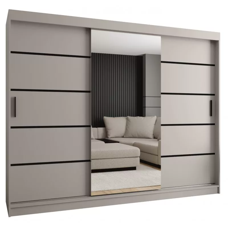 Široká šatní skříň 250 cm CASANDRA se zrcadlem - kašmír / černá
