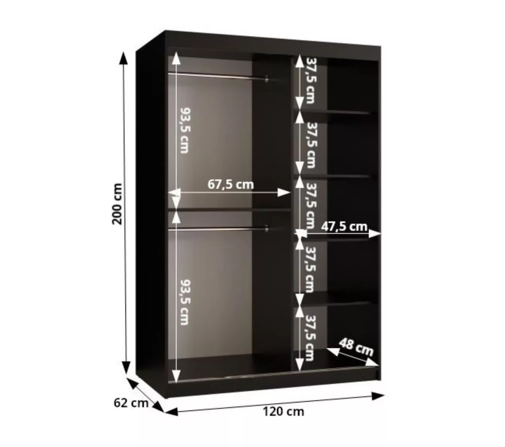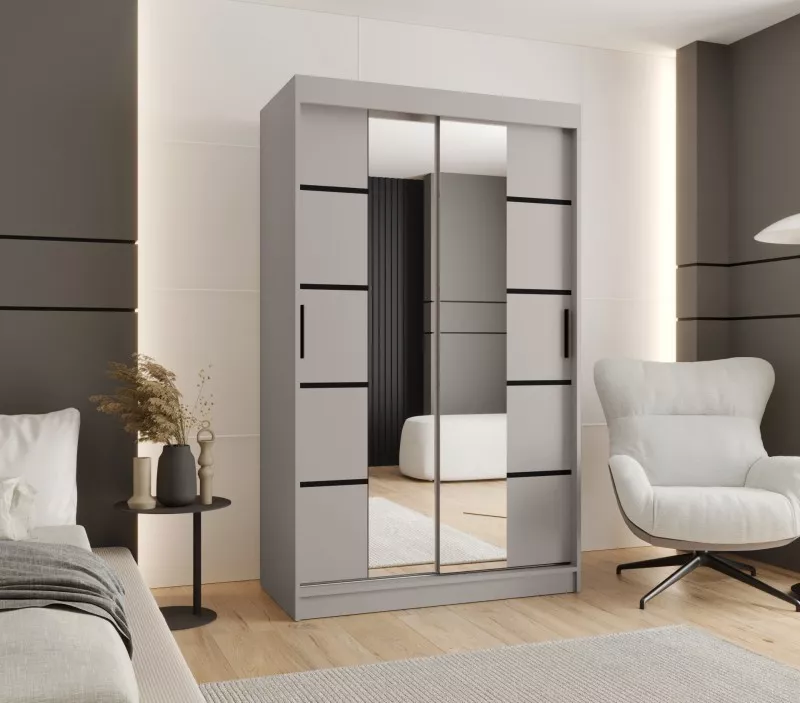 Úzká šatní skříň s posuvnými dveřmi 120 cm CASANDRA díky svému jednoduchému designu a ozdobným černým lištám zapadne do všech ložnic. Skříň disponuje 2 šatními tyčemi a 5 prostornými policemi. Je vyrobená z odolných materiálů, díky čemuž vám bude sloužit mnoho let.