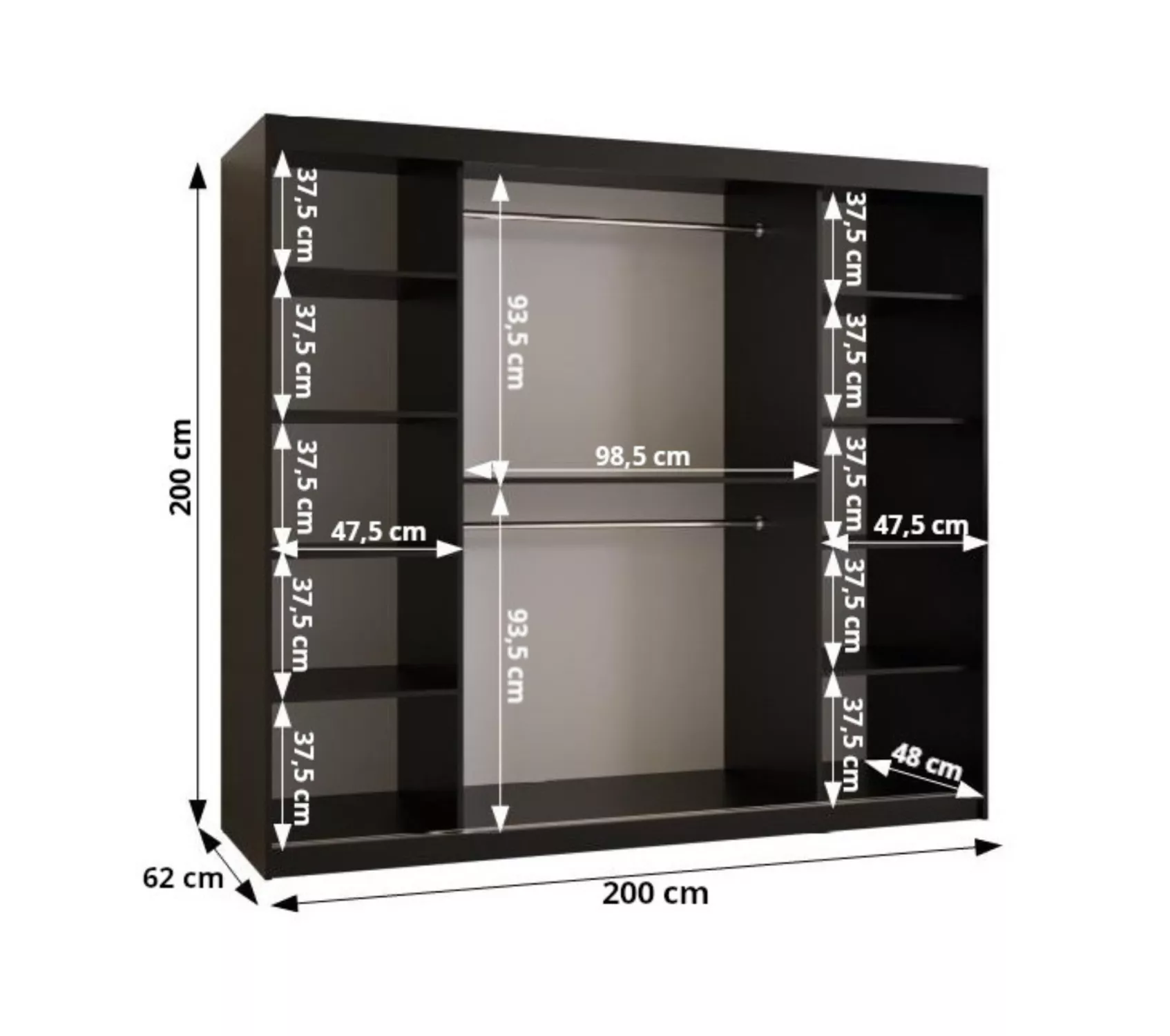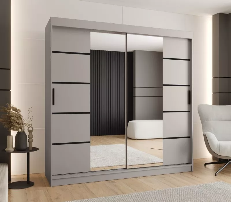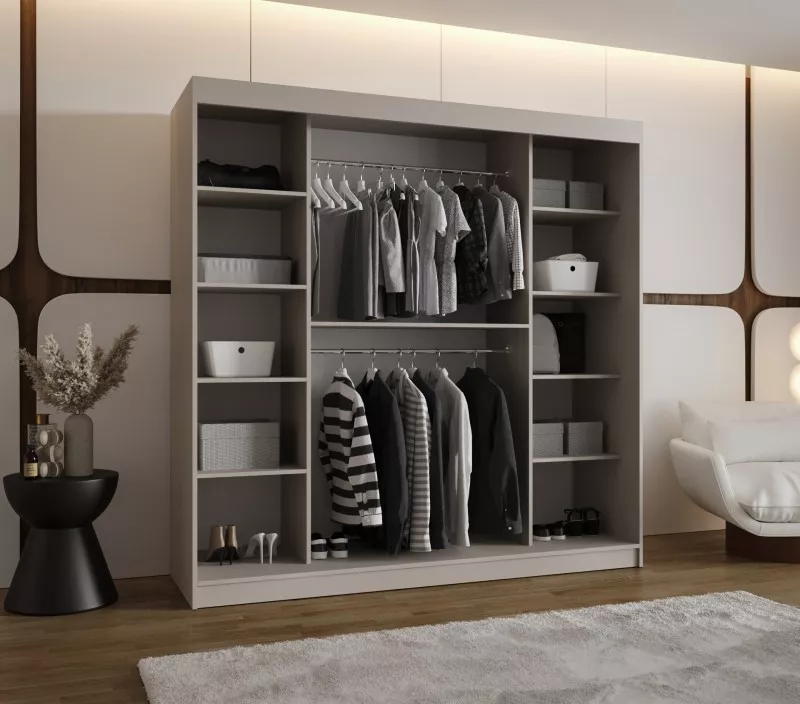 Široká šatní skříň s posuvnými dveřmi 200 cm CASANDRA díky svému jednoduchému designu a ozdobným černým lištám zapadne do všech ložnic. Skříň disponuje 2 šatními tyčemi a 9 prostornými policemi. Je vyrobená z odolných materiálů, díky čemuž vám bude sloužit mnoho let.