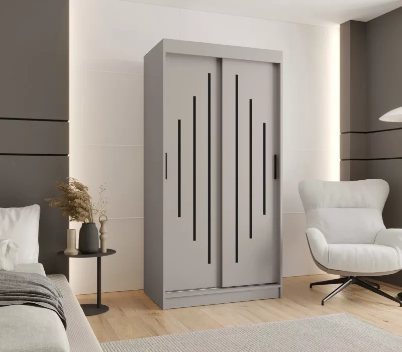 Šatní skříň 100 cm CASANDRA s posuvnými dveřmi díky svému zdobení v podobě černých lišt ozvláštní každou ložnici. Skříň je tvořená 2 šatními tyčemi a 5 prostornými policemi. Je vyrobená z odolných materiálů, díky čemuž vám bude sloužit mnoho let.