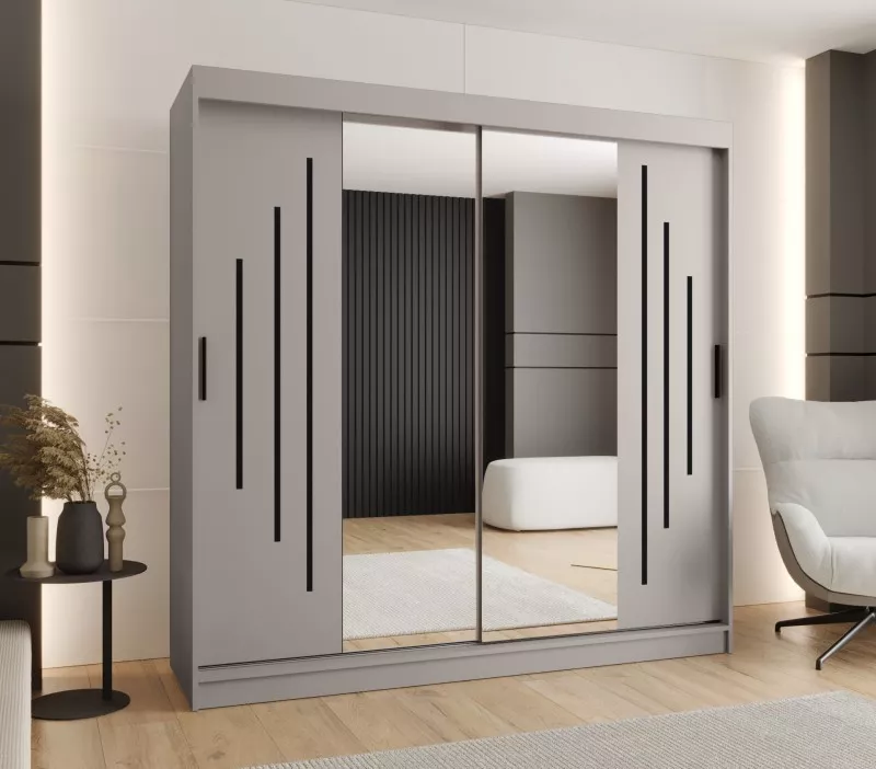 Šatní skříň 200 cm CASANDRA se zrcadlem díky svému zdobení v podobě černých lišt ozvláštní každou ložnici. Skříň je tvořená 2 šatními tyčemi a 9 prostornými policemi. Je vyrobená z odolných materiálů, díky čemuž vám bude sloužit mnoho let.