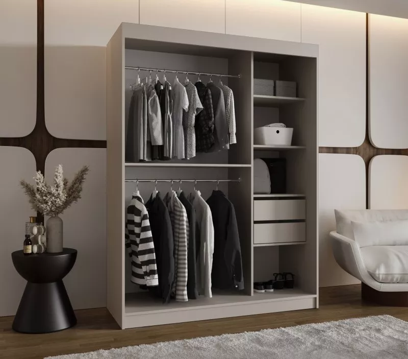 Zrcadlová šatní skříň 150 cm CASANDRA díky svému zdobení v podobě černých lišt ozvláštní každou ložnici. Skříň je tvořená 2 šatními tyčemi a 5 prostornými policemi. Je vyrobená z odolných materiálů, díky čemuž vám bude sloužit mnoho let.