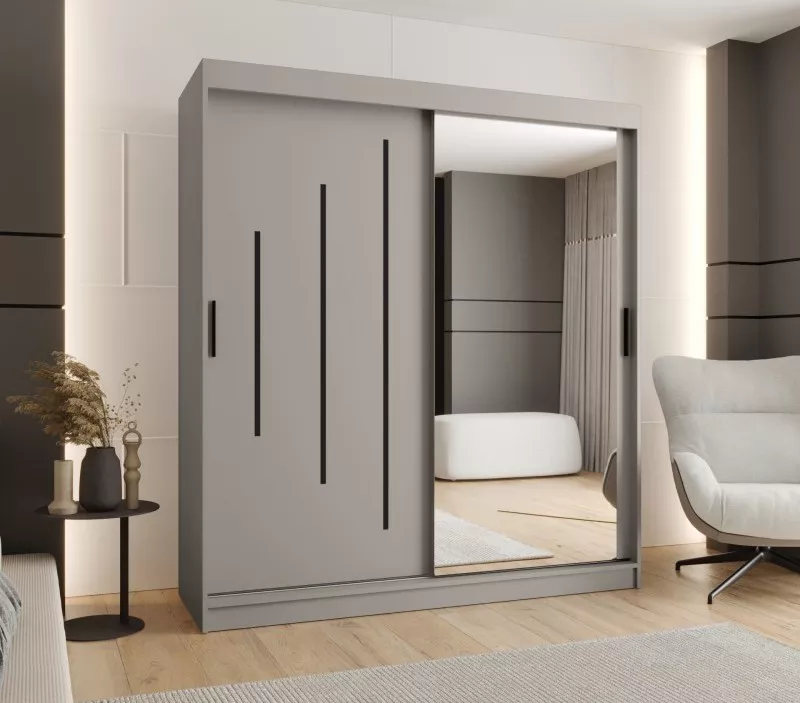 Zrcadlová šatní skříň 180 cm CASANDRA díky svému zdobení v podobě černých lišt ozvláštní každou ložnici. Skříň je tvořená 2 šatními tyčemi a 9 prostornými policemi. Je vyrobená z odolných materiálů, díky čemuž vám bude sloužit mnoho let.