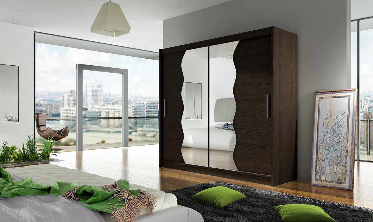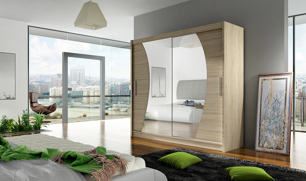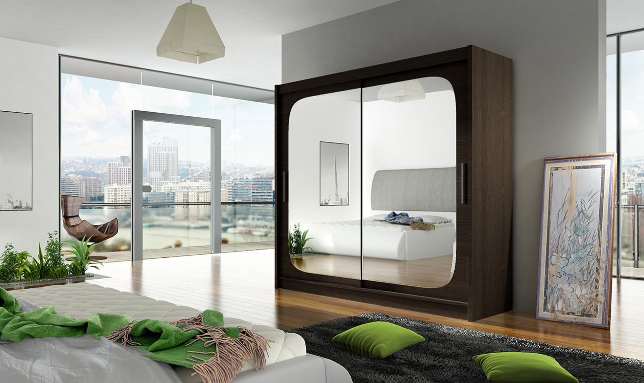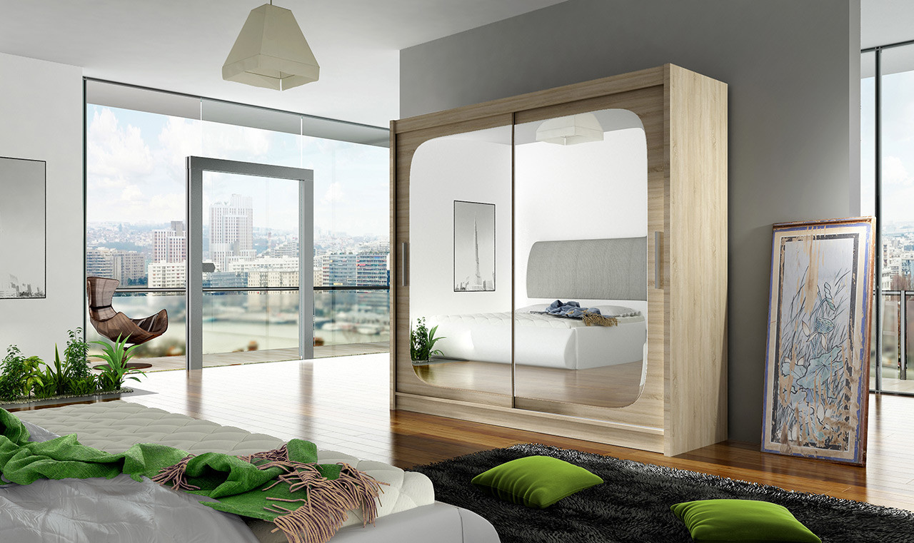 Prostorná šatní skříň o šířce 180 cm bude svým moderním vzhledem zajímavým prvkem v místnosti a díky posuvným dveřím vyřeší případný nedostatek místa. Vnitřní uspořádání skříně nabízí dostatek polic k uskladnění osobních věcí a šatní tyč k zavěšení ramínek. Zrcadlo na dveřích je elegantním i praktickým prvkem.