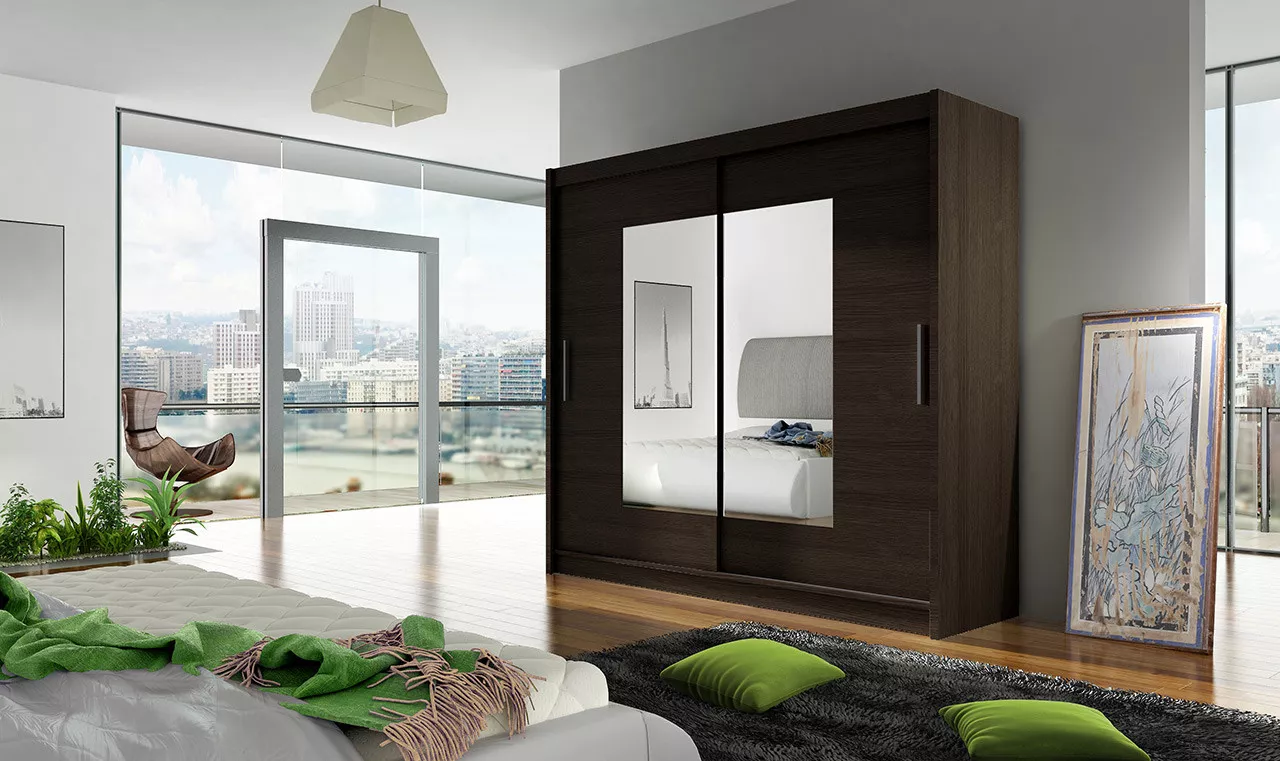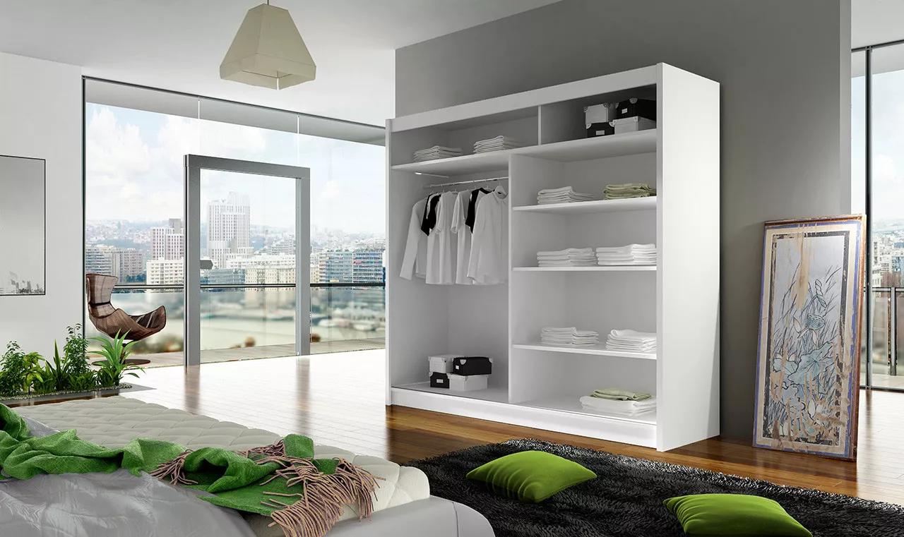 Prostorná šatní skříň o šířce 180 cm bude svým moderním vzhledem zajímavým prvkem v místnosti a díky posuvným dveřím vyřeší případný nedostatek místa. Vnitřní uspořádání skříně nabízí dostatek polic k uskladnění osobních věcí a šatní tyč k zavěšení ramínek. Zrcadlo na dveřích je elegantním i praktickým prvkem.