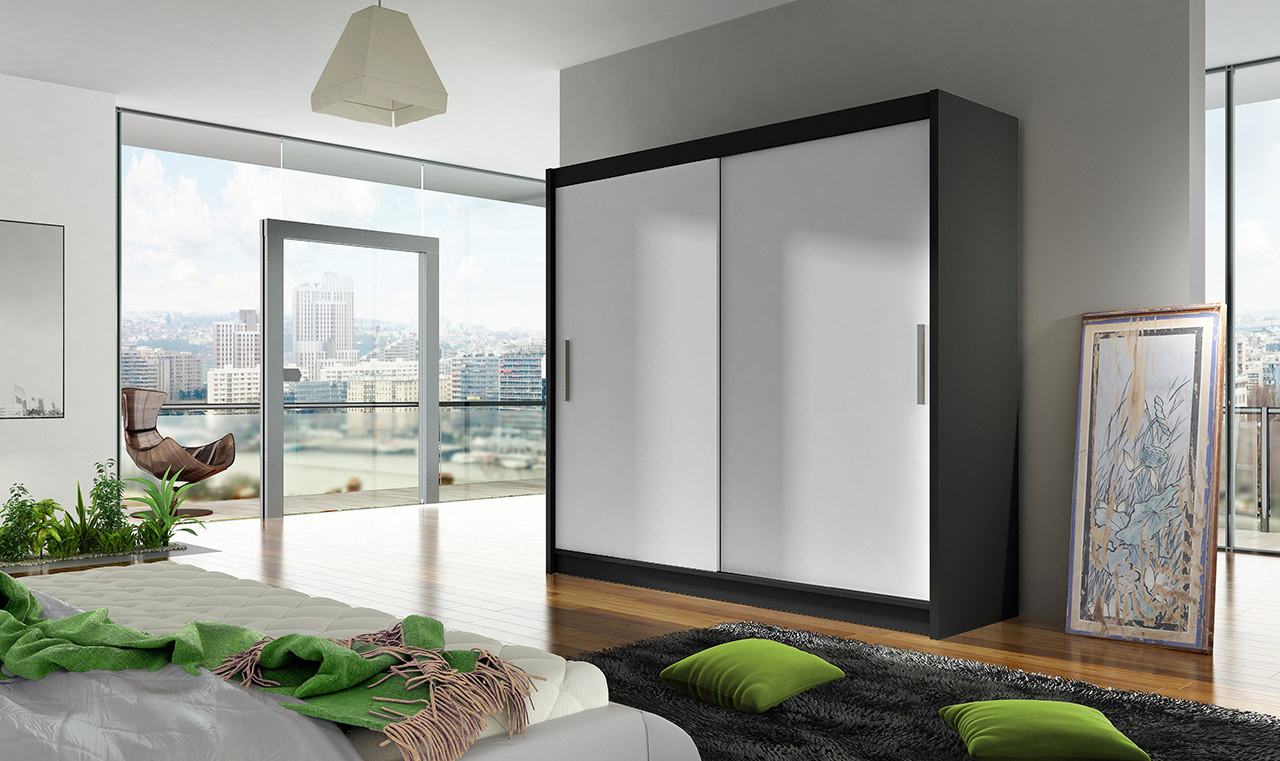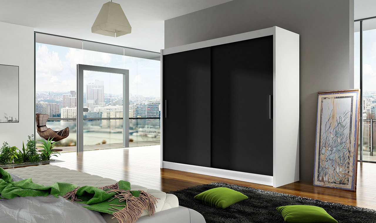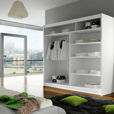 Prostorná šatní skříň o šířce 180 cm bude svým moderním vzhledem zajímavým prvkem v místnosti a díky posuvným dveřím vyřeší případný nedostatek místa. Vnitřní uspořádání skříně nabízí dostatek polic k uskladnění osobních věcí a šatní tyč k zavěšení ramínek. Zrcadlo na dveřích je elegantním i praktickým prvkem.
