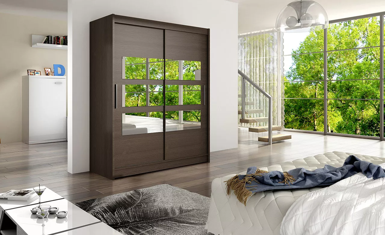 Prostorná šatní skříň o šířce 150 cm bude svým moderním vzhledem zajímavým prvkem v místnosti a díky posuvným dveřím vyřeší případný nedostatek místa. Vnitřní uspořádání skříně nabízí dostatek polic k uskladnění osobních věcí a šatní tyč k zavěšení ramínek. Zrcadlo na dveřích je elegantním i praktickým prvkem.