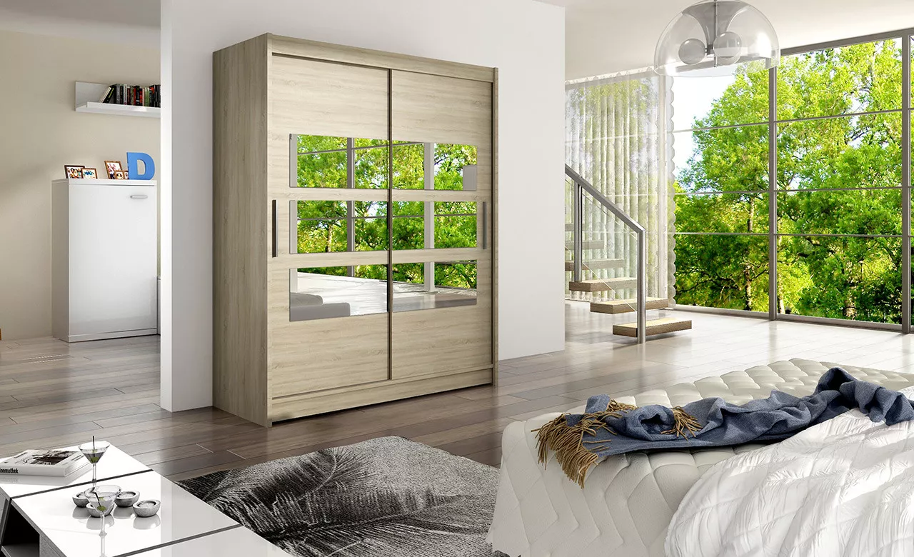 Prostorná šatní skříň o šířce 150 cm bude svým moderním vzhledem zajímavým prvkem v místnosti a díky posuvným dveřím vyřeší případný nedostatek místa. Vnitřní uspořádání skříně nabízí dostatek polic k uskladnění osobních věcí a šatní tyč k zavěšení ramínek. Zrcadlo na dveřích je elegantním i praktickým prvkem.