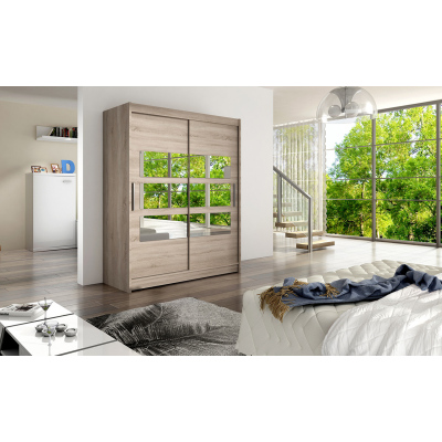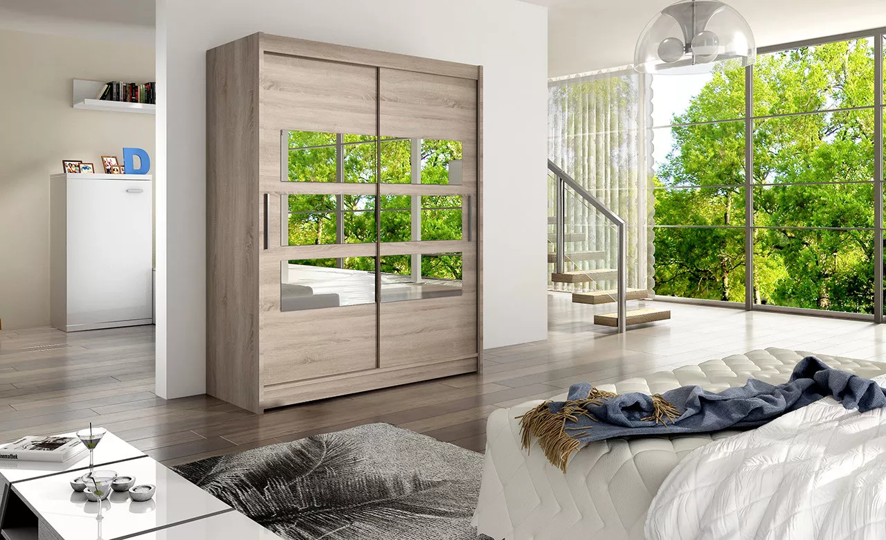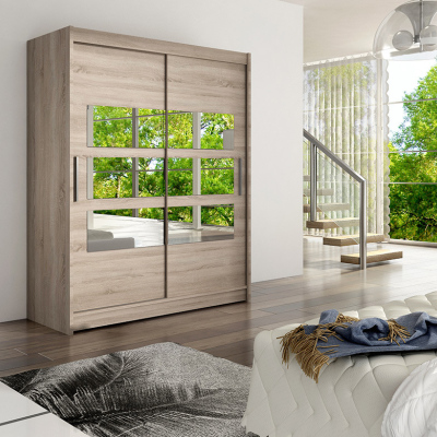 Prostorná šatní skříň o šířce 150 cm bude svým moderním vzhledem zajímavým prvkem v místnosti a díky posuvným dveřím vyřeší případný nedostatek místa. Vnitřní uspořádání skříně nabízí dostatek polic k uskladnění osobních věcí a šatní tyč k zavěšení ramínek. Zrcadlo na dveřích je elegantním i praktickým prvkem.