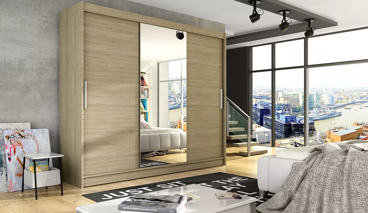 Prostorná šatní skříň o šířce 250 cm bude svým moderním vzhledem zajímavým prvkem v místnosti a díky posuvným dveřím vyřeší případný nedostatek místa. Vnitřní uspořádání skříně nabízí dostatek polic k uskladnění osobních věcí a šatní tyč k zavěšení ramínek. Velké zrcadlo na dveřích je elegantním i praktickým prvkem.