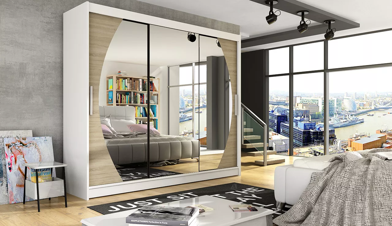 Prostorná šatní skříň o šířce 250 cm bude svým moderním vzhledem zajímavým prvkem v místnosti a díky posuvným dveřím vyřeší případný nedostatek místa. Vnitřní uspořádání skříně nabízí dostatek polic k uskladnění osobních věcí a šatní tyč k zavěšení ramínek. Velké zrcadlo se jistě stane každodenním praktickým pomocníkem.