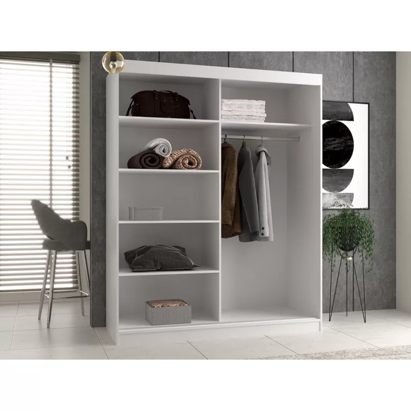 Velmi prostorná moderní šatní skříň RANNO 6 upoutá pozornost každého, kdo hledá funkční a stylové řešení do své ložnice. Zrcadla umístěná na dvířkách opticky zvětšují prostor a vnáší do interiéru více světla. Dvoje posuvné dveře umožňují snadný přístup do skříně a optimální využití prostoru.
