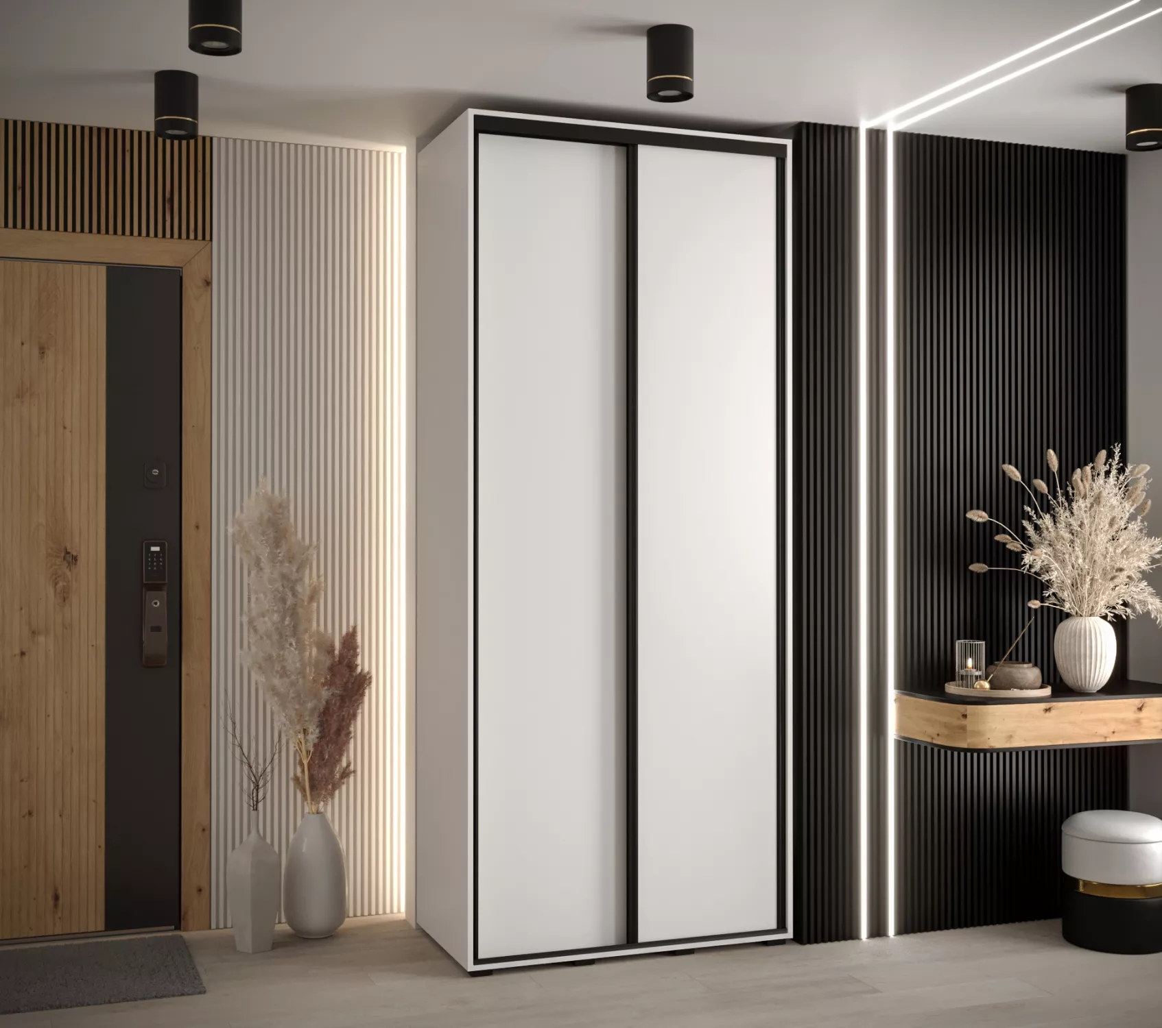 Šatní skříň ASIRI zaujme svým moderním designem a praktickými prvky. Šatní skříň má posuvné dveře, které se neotvírají do prostoru a ušetří tak spoustu místa.