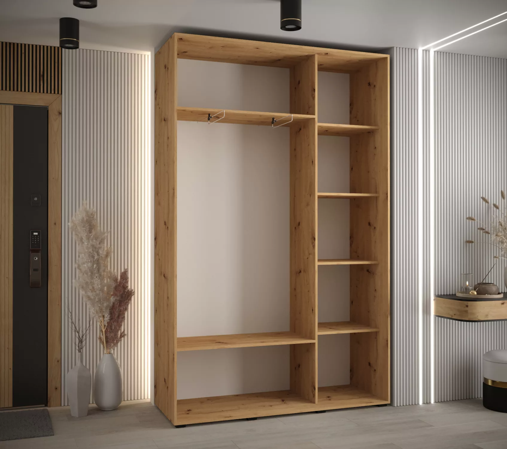 Šatní skříň ASIRI zaujme svým moderním designem a praktickými prvky. Šatní skříň má posuvné dveře, které se neotvírají do prostoru a ušetří tak spoustu místa.
