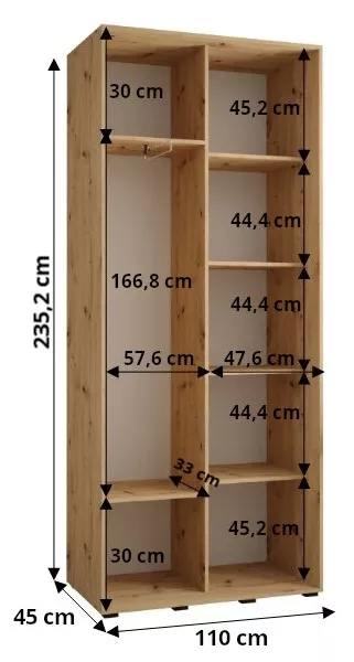 Šatní skříň ASIRI zaujme svým moderním designem a praktickými prvky. Šatní skříň má posuvné dveře, které se neotvírají do prostoru a ušetří tak spoustu místa.