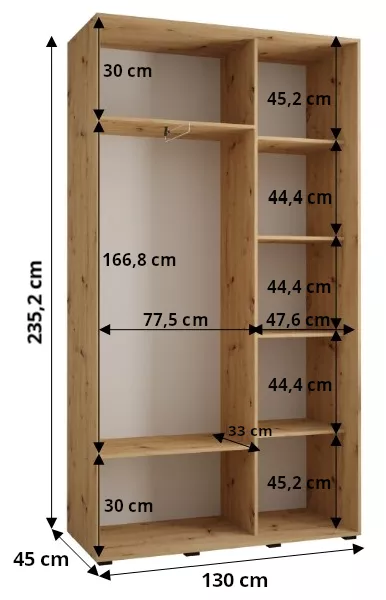 Šatní skříň ASIRI zaujme svým moderním designem a praktickými prvky. Šatní skříň má posuvné dveře, které se neotvírají do prostoru a ušetří tak spoustu místa.