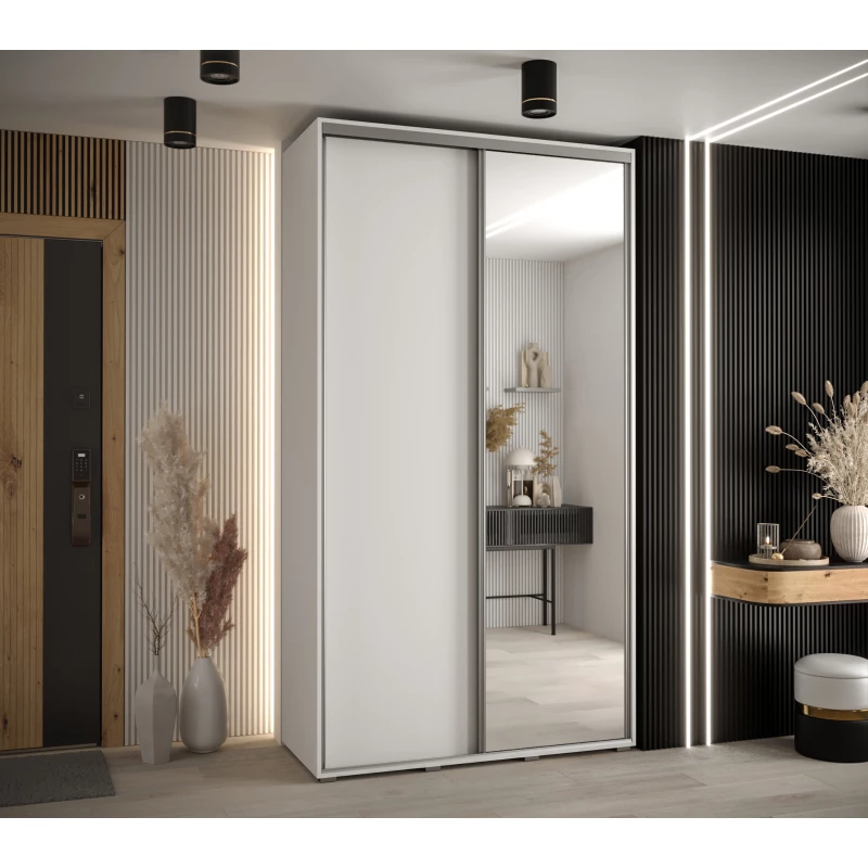 Šatní skříň ASIRI zaujme svým moderním designem a praktickými prvky. Šatní skříň má posuvné dveře, které se neotvírají do prostoru a ušetří tak spoustu místa.