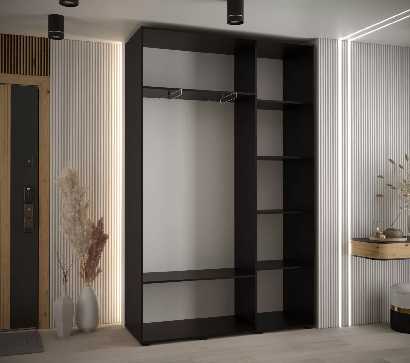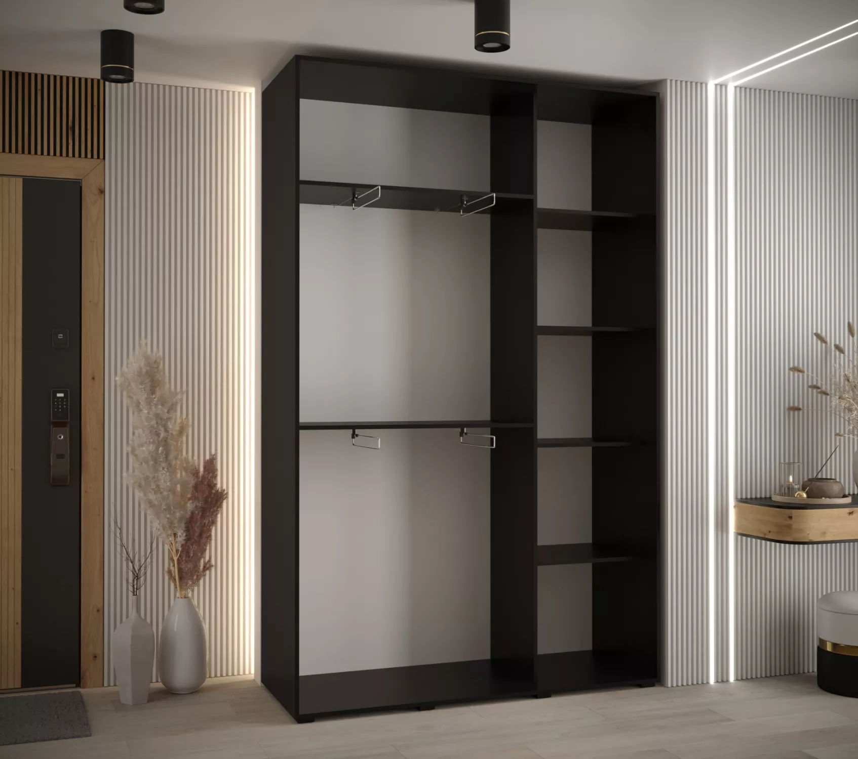 Šatní skříň ASIRI zaujme svým moderním designem a praktickými prvky. Šatní skříň má posuvné dveře, které se neotvírají do prostoru a ušetří tak spoustu místa.