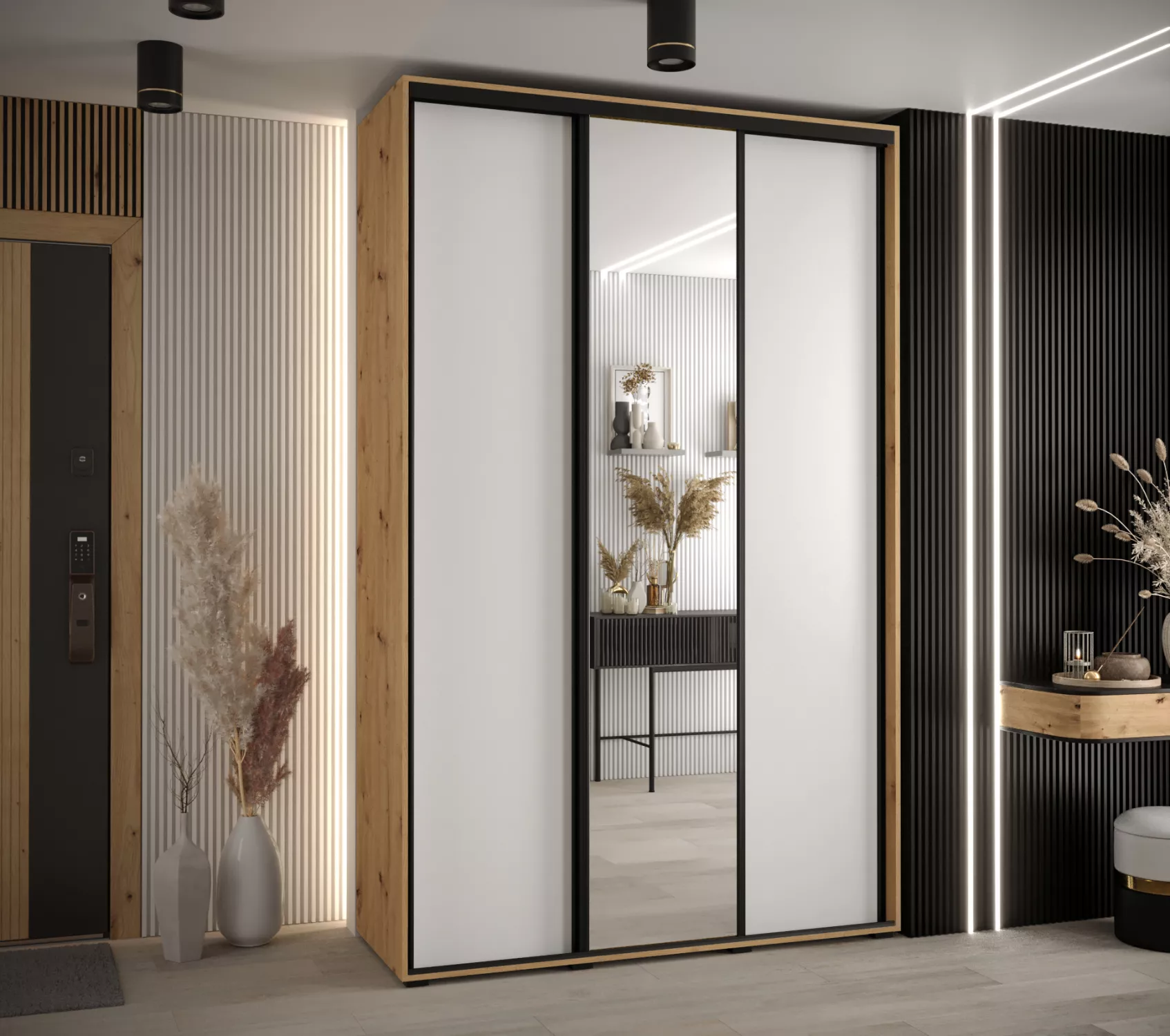 Šatní skříň ASIRI zaujme svým moderním designem a praktickými prvky. Šatní skříň má posuvné dveře, které se neotvírají do prostoru a ušetří tak spoustu místa.
