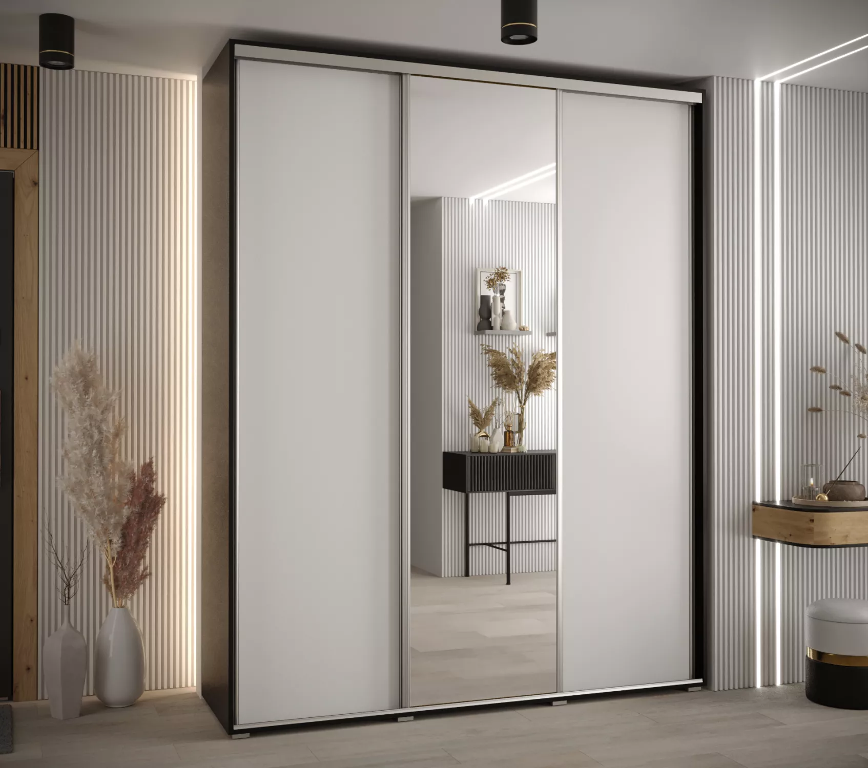 Šatní skříň ASIRI zaujme svým moderním designem a praktickými prvky. Šatní skříň má posuvné dveře, které se neotvírají do prostoru a ušetří tak spoustu místa.