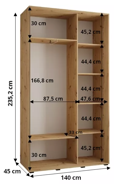 Šatní skříň ASIRI zaujme svým moderním designem a praktickými prvky. Šatní skříň má posuvné dveře, které se neotvírají do prostoru a ušetří tak spoustu místa.