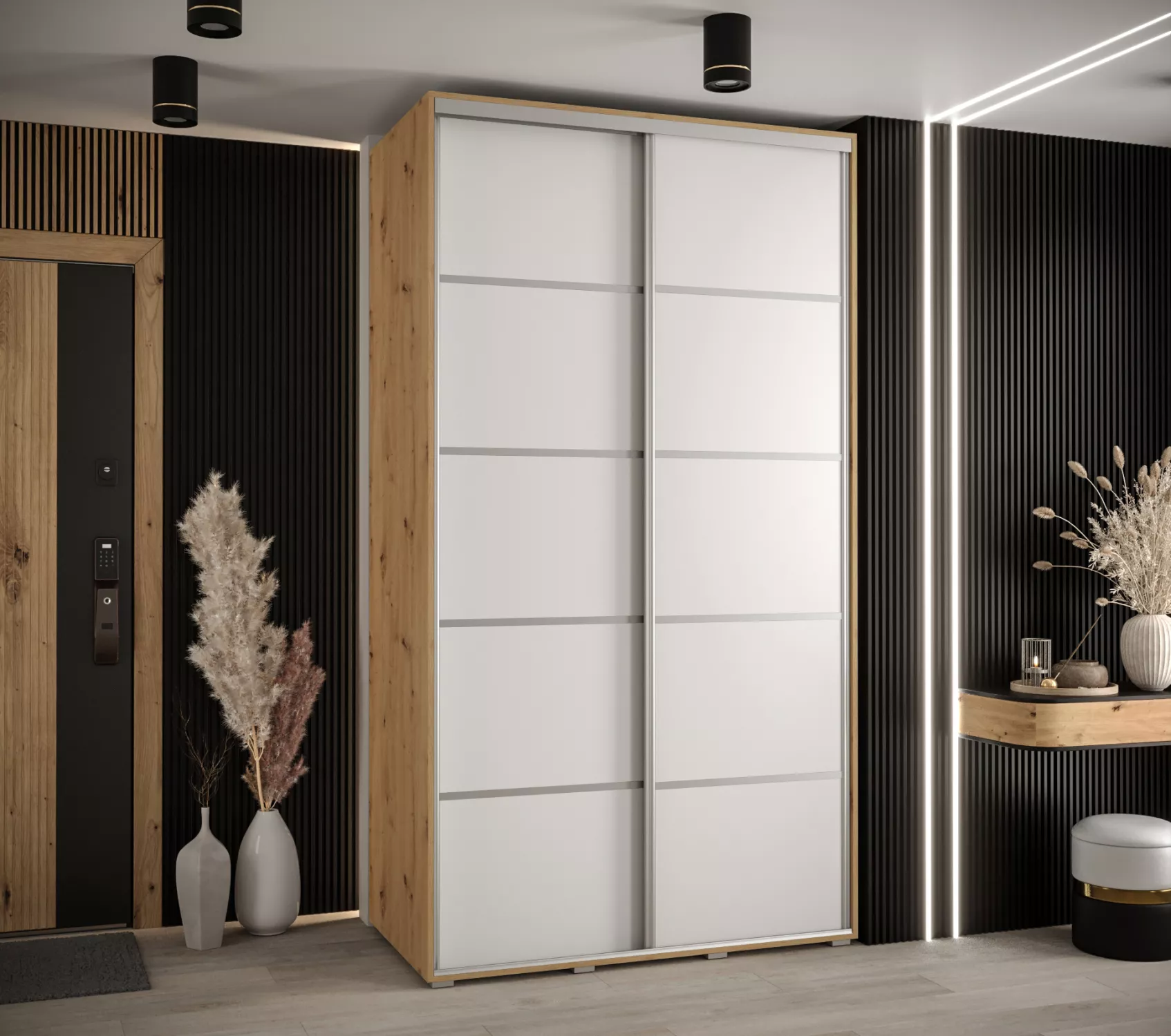 Šatní skříň ASIRI 4 - 140/45 cm, dub artisan / bílá / stříbrná
