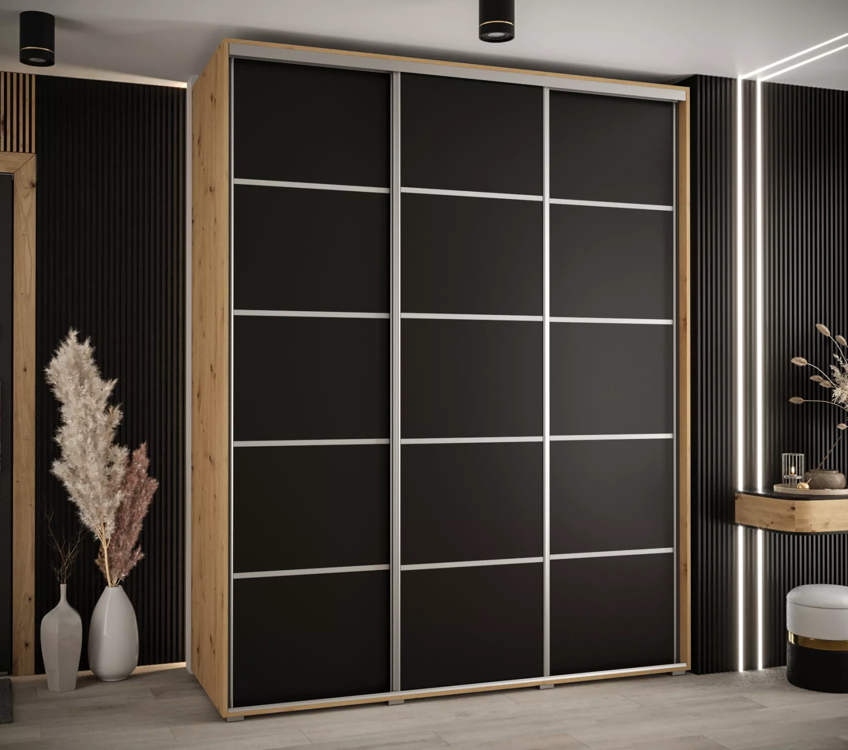 Šatní skříň ASIRI 4 - 200/45 cm, dub artisan / černá / stříbrná