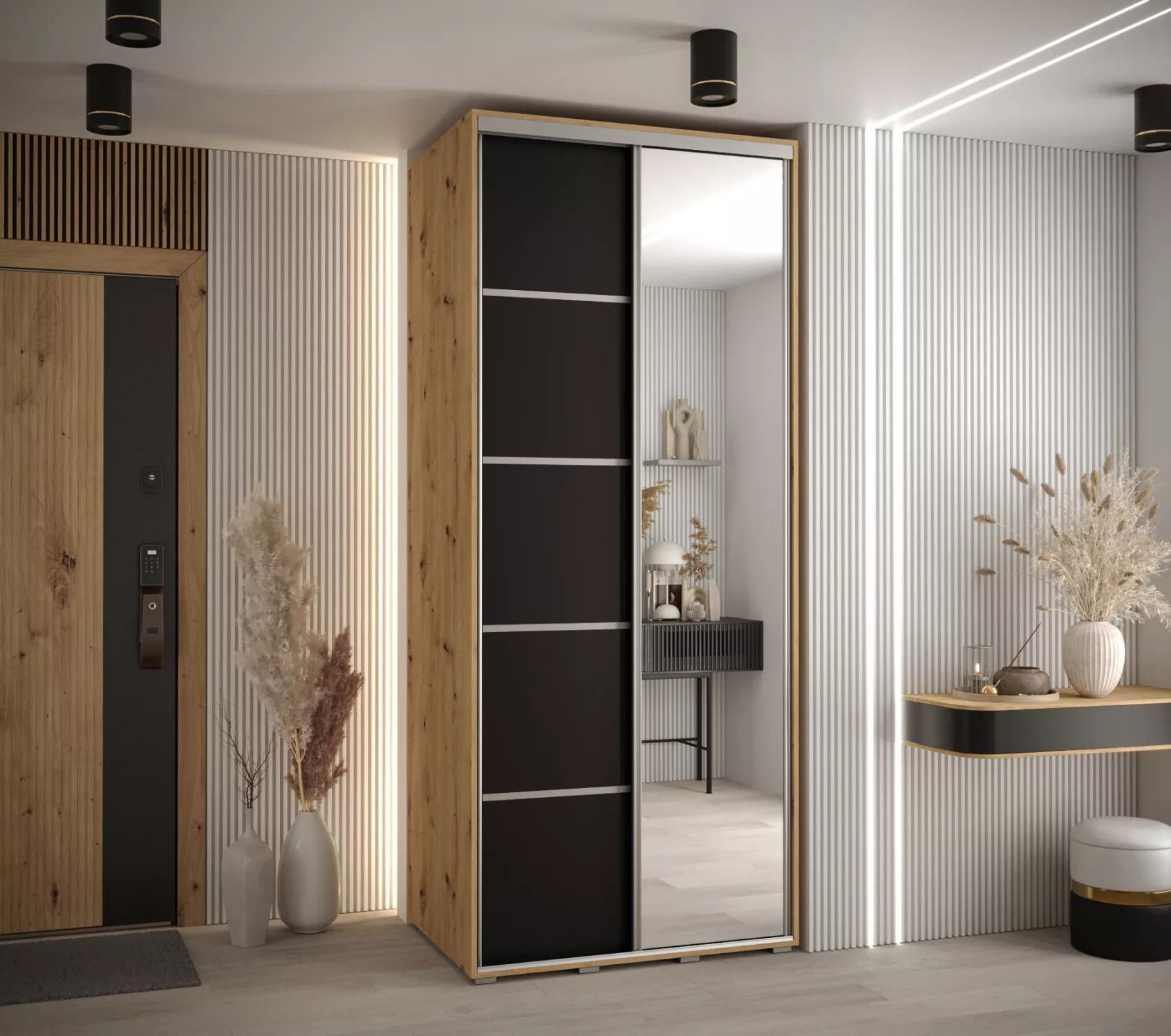 Šatní skříň ASIRI 5 - 100/45 cm, dub artisan / černá / stříbrná