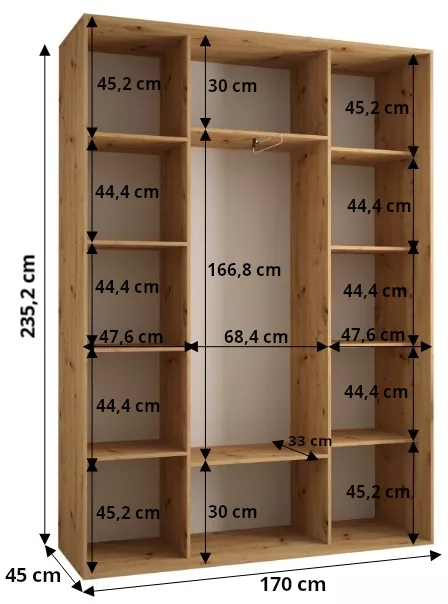 Šatní skříň ASIRI zaujme svým moderním designem a praktickými prvky. Šatní skříň má posuvné dveře, které se neotvírají do prostoru a ušetří tak spoustu místa.