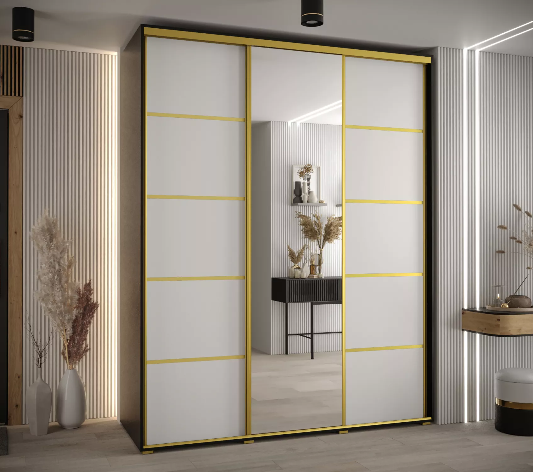 Šatní skříň ASIRI 5 - 200/45 cm, černá / bílá / zlatá