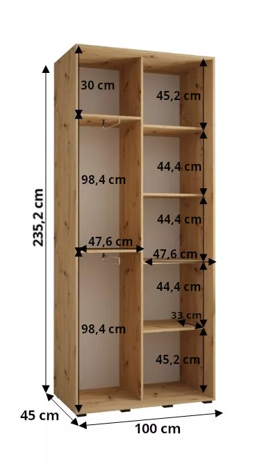 Šatní skříň ASIRI zaujme svým moderním designem a praktickými prvky. Šatní skříň má posuvné dveře, které se neotvírají do prostoru a ušetří tak spoustu místa.