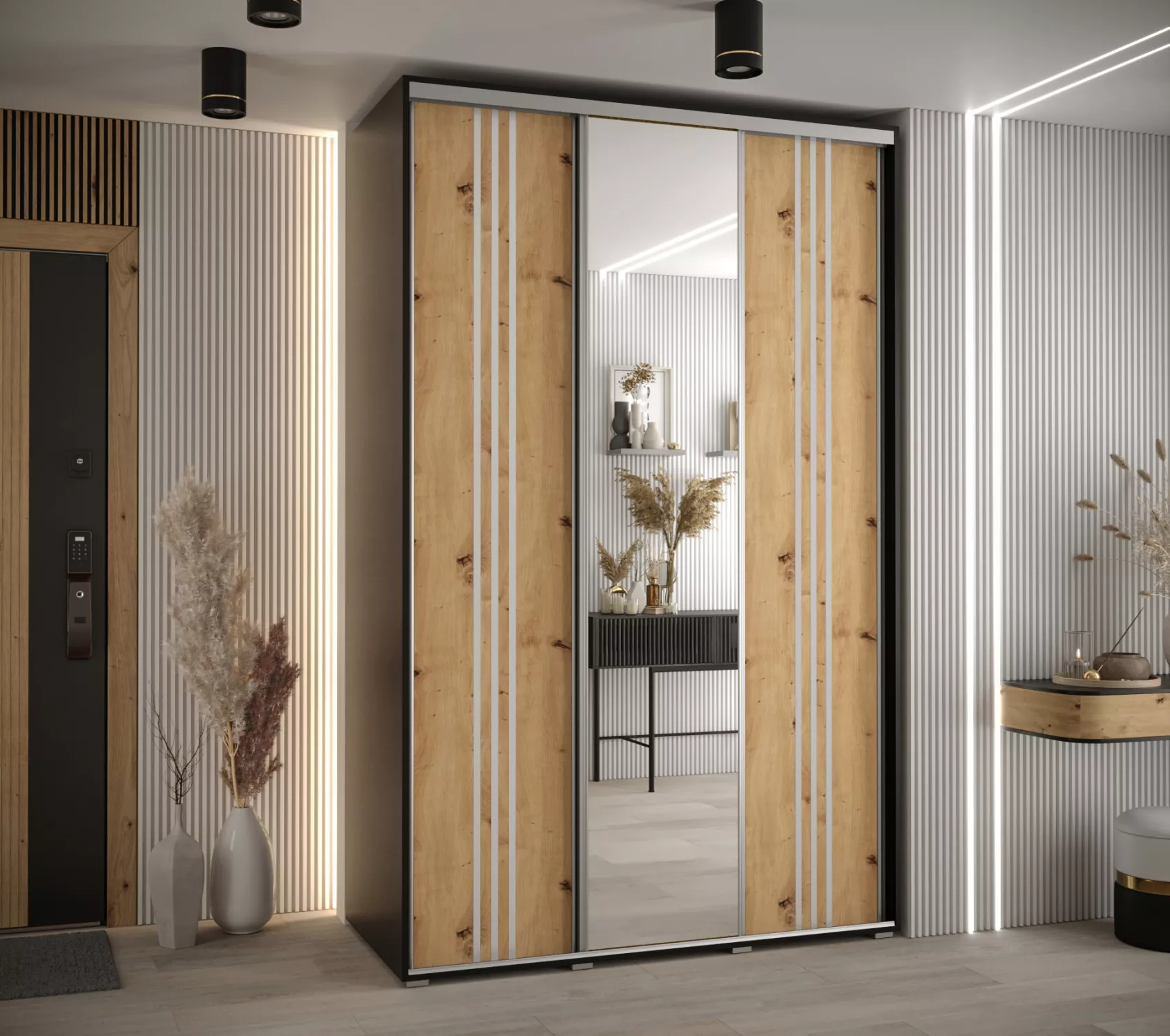 Šatní skříň ASIRI zaujme svým moderním designem a praktickými prvky. Šatní skříň má posuvné dveře, které se neotvírají do prostoru a ušetří tak spoustu místa.