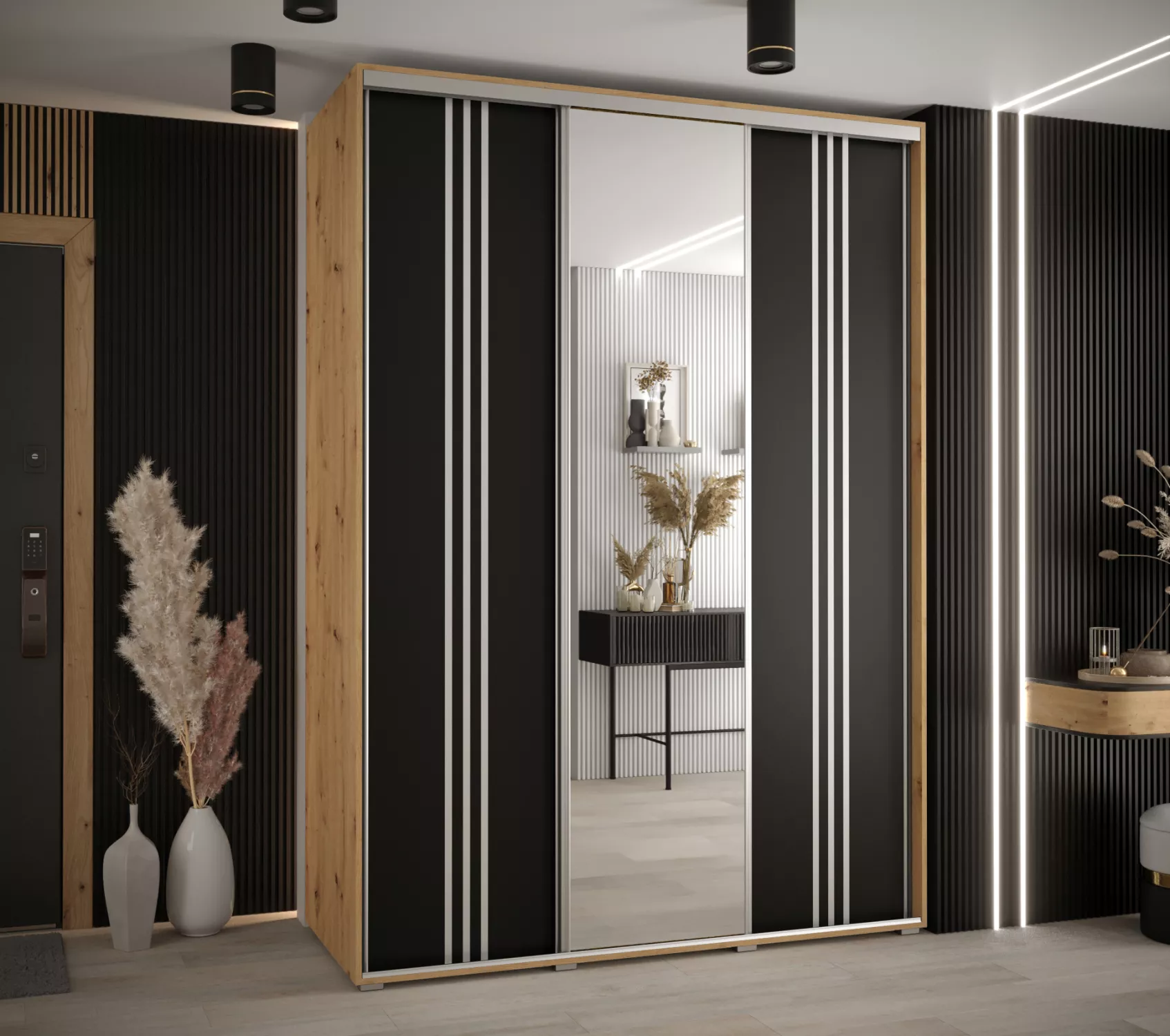 Šatní skříň ASIRI zaujme svým moderním designem a praktickými prvky. Šatní skříň má posuvné dveře, které se neotvírají do prostoru a ušetří tak spoustu místa.