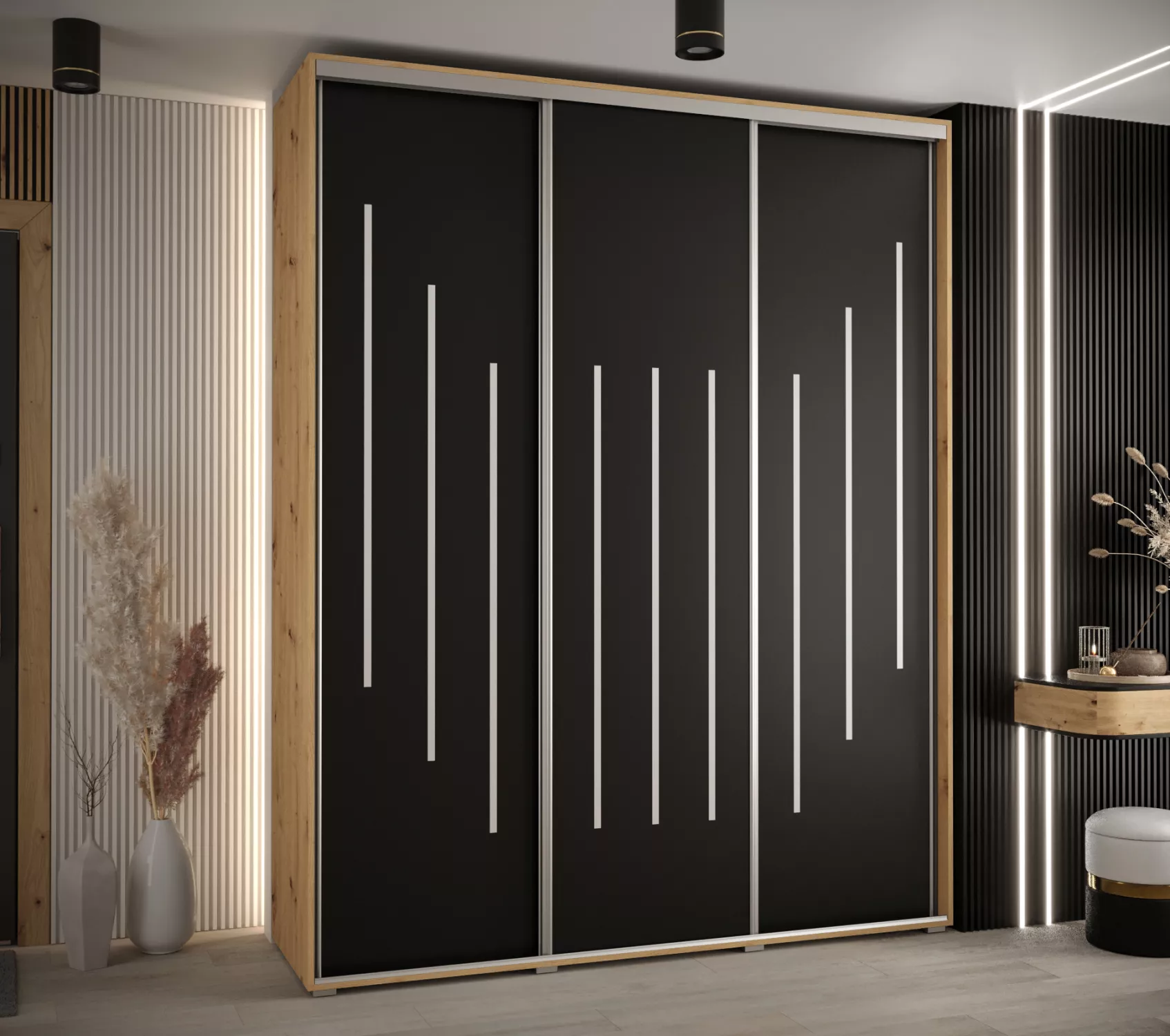 Šatní skříň ASIRI zaujme svým moderním designem a praktickými prvky. Šatní skříň má posuvné dveře, které se neotvírají do prostoru a ušetří tak spoustu místa.