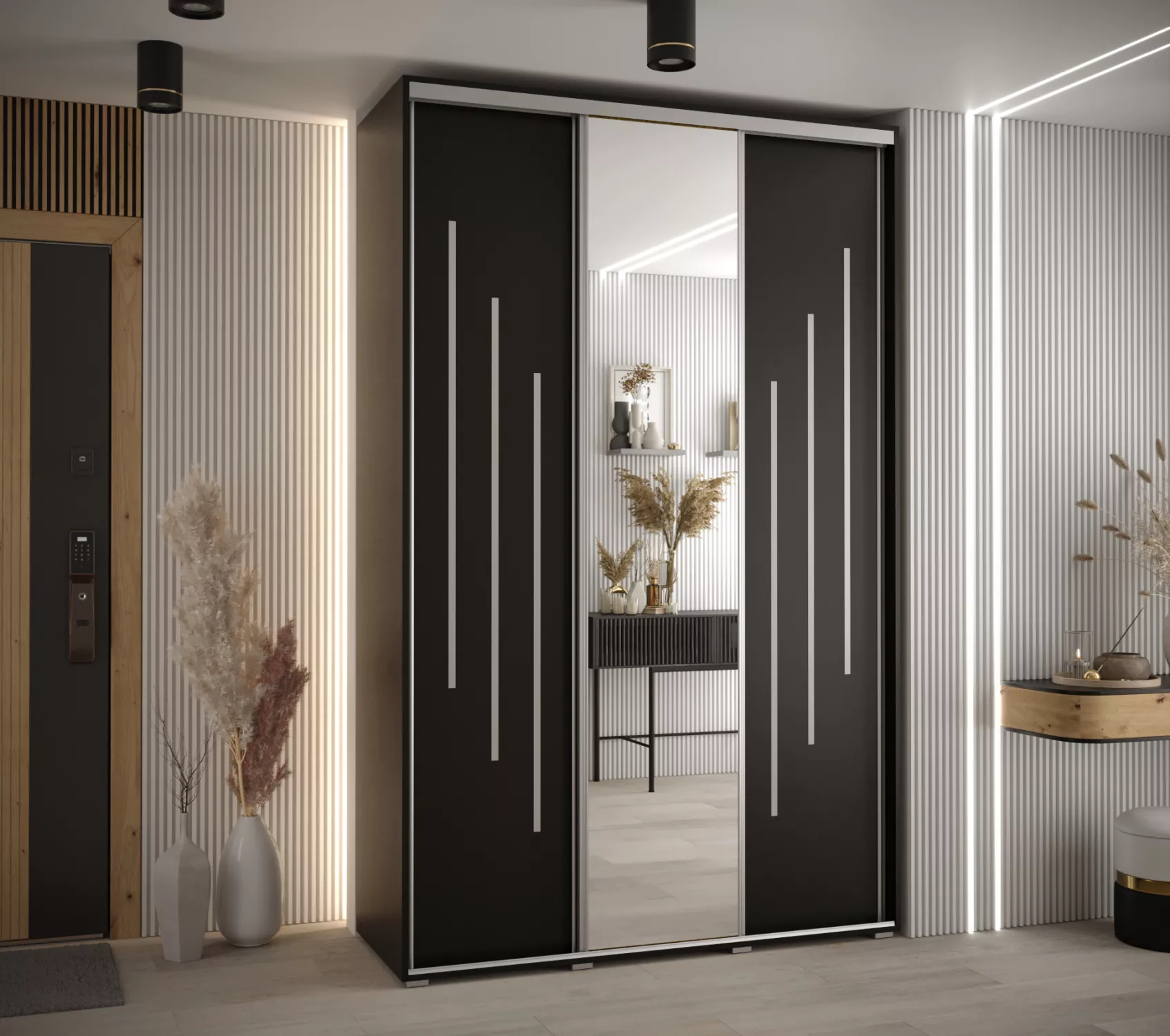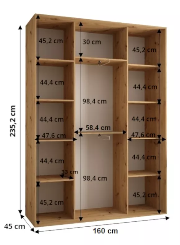 Šatní skříň ASIRI zaujme svým moderním designem a praktickými prvky. Šatní skříň má posuvné dveře, které se neotvírají do prostoru a ušetří tak spoustu místa.