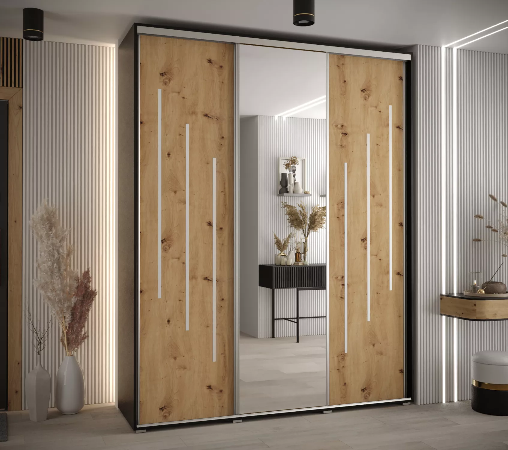 Šatní skříň ASIRI zaujme svým moderním designem a praktickými prvky. Šatní skříň má posuvné dveře, které se neotvírají do prostoru a ušetří tak spoustu místa.