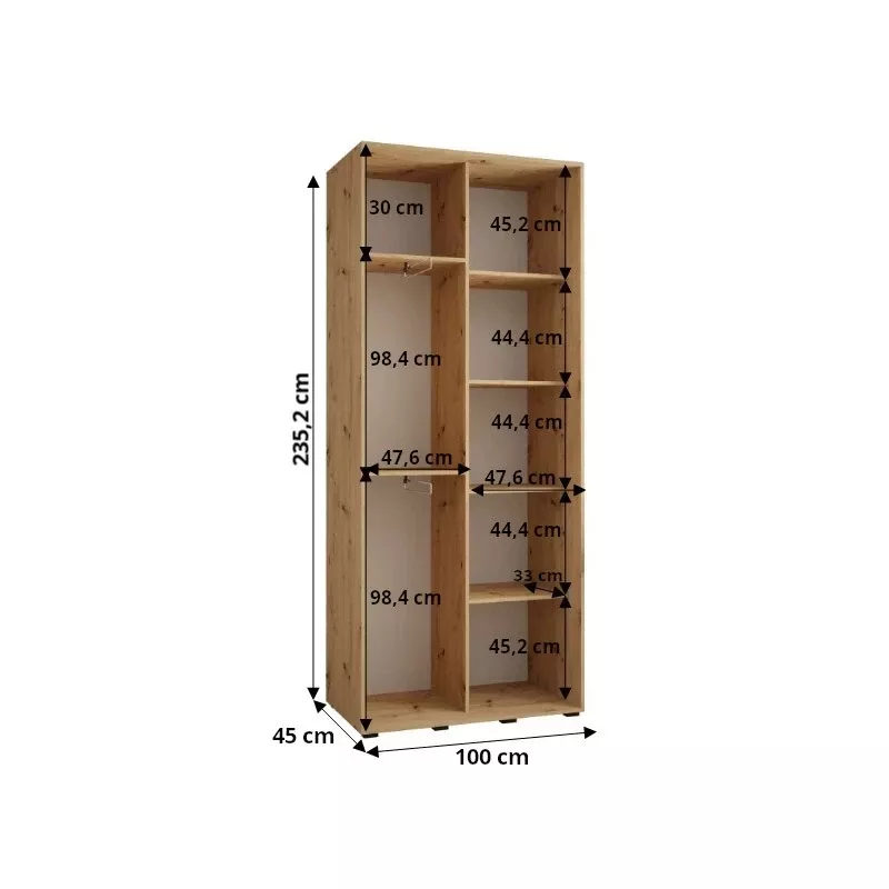 Šatní skříň ASIRI zaujme svým moderním designem a praktickými prvky. Šatní skříň má posuvné dveře, které se neotvírají do prostoru a ušetří tak spoustu místa.