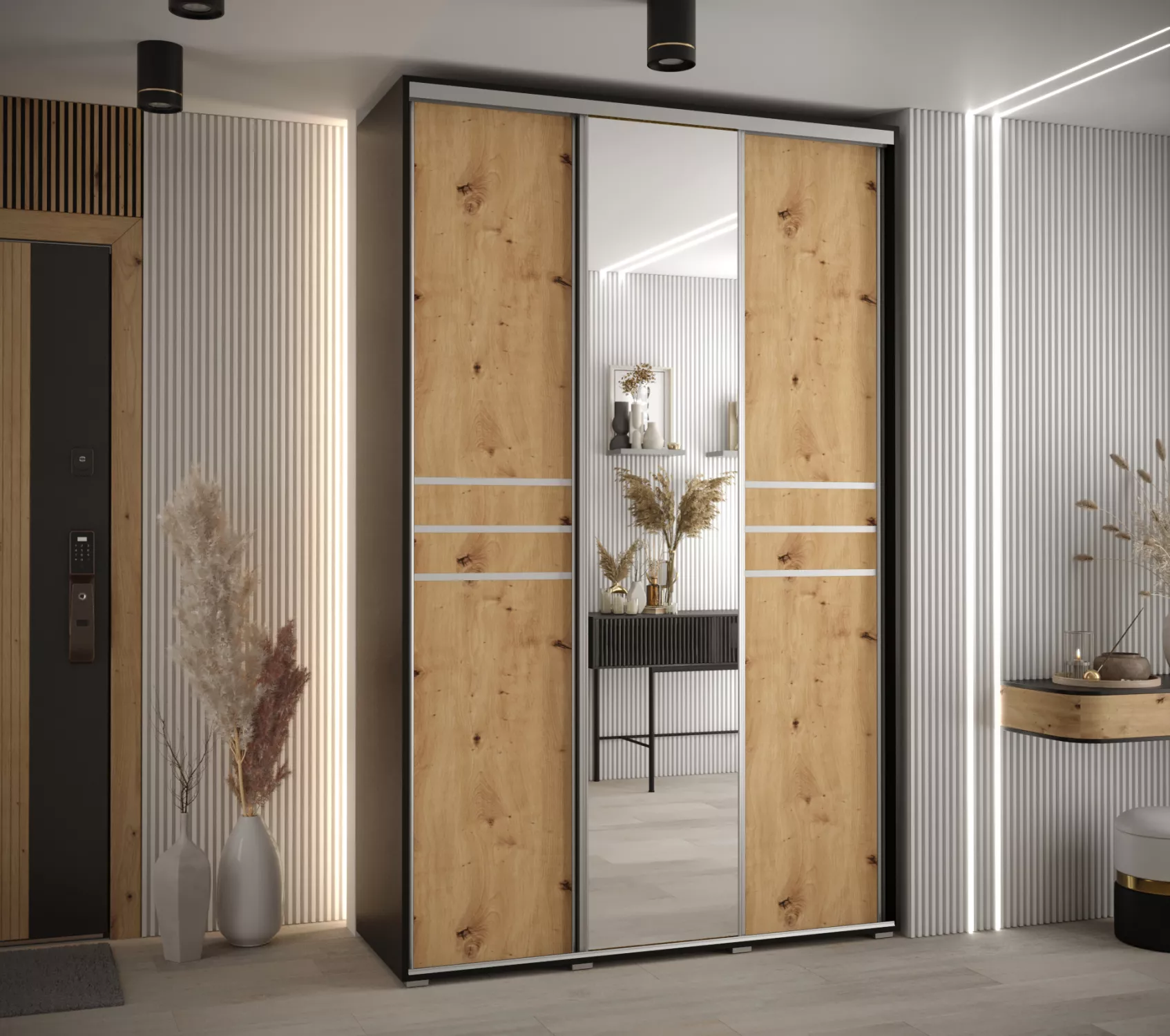 Šatní skříň ASIRI zaujme svým moderním designem a praktickými prvky. Šatní skříň má posuvné dveře, které se neotvírají do prostoru a ušetří tak spoustu místa.