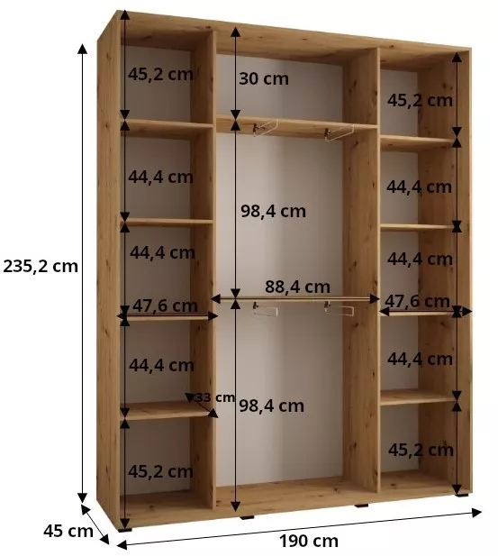 Šatní skříň ASIRI zaujme svým moderním designem a praktickými prvky. Šatní skříň má posuvné dveře, které se neotvírají do prostoru a ušetří tak spoustu místa.