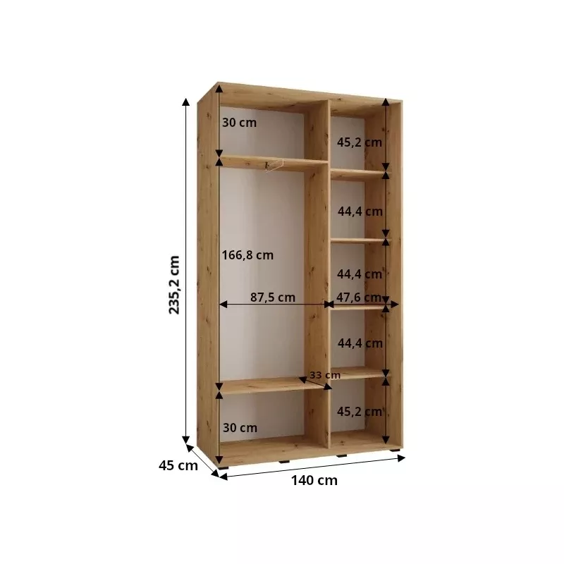Šatní skříň ASIRI zaujme svým moderním designem a praktickými prvky. Šatní skříň má posuvné dveře, které se neotvírají do prostoru a ušetří tak spoustu místa.