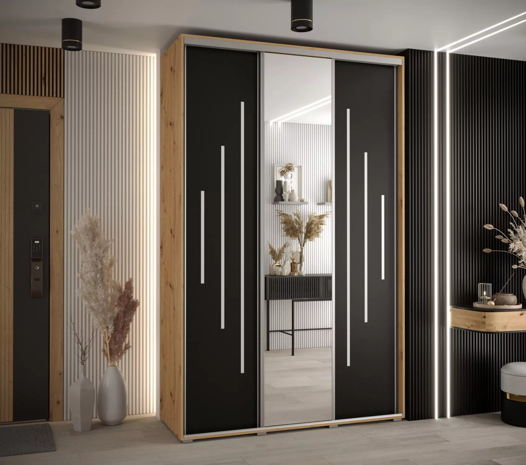 Šatní skříň ASIRI 13 - 150/45 cm, dub artisan / černá / stříbrná