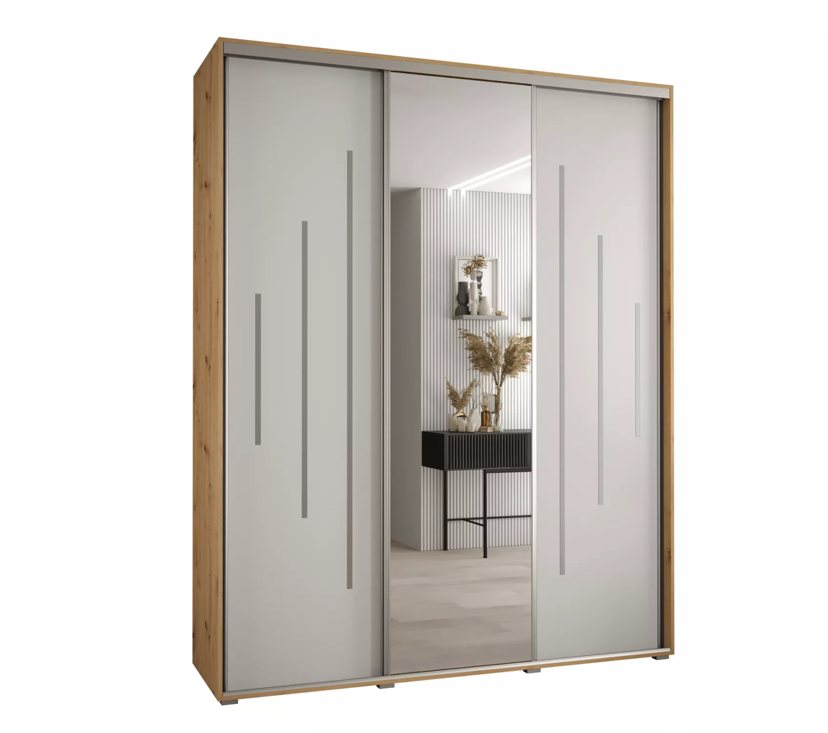 Šatní skříň ASIRI zaujme svým moderním designem a praktickými prvky. Šatní skříň má posuvné dveře, které se neotvírají do prostoru a ušetří tak spoustu místa.