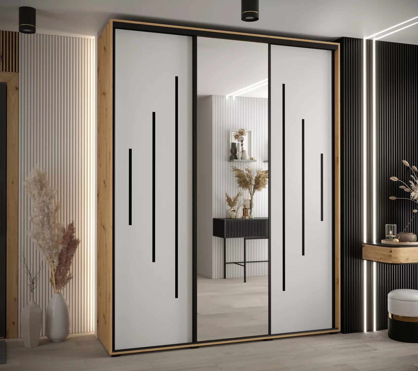 Šatní skříň ASIRI zaujme svým moderním designem a praktickými prvky. Šatní skříň má posuvné dveře, které se neotvírají do prostoru a ušetří tak spoustu místa.