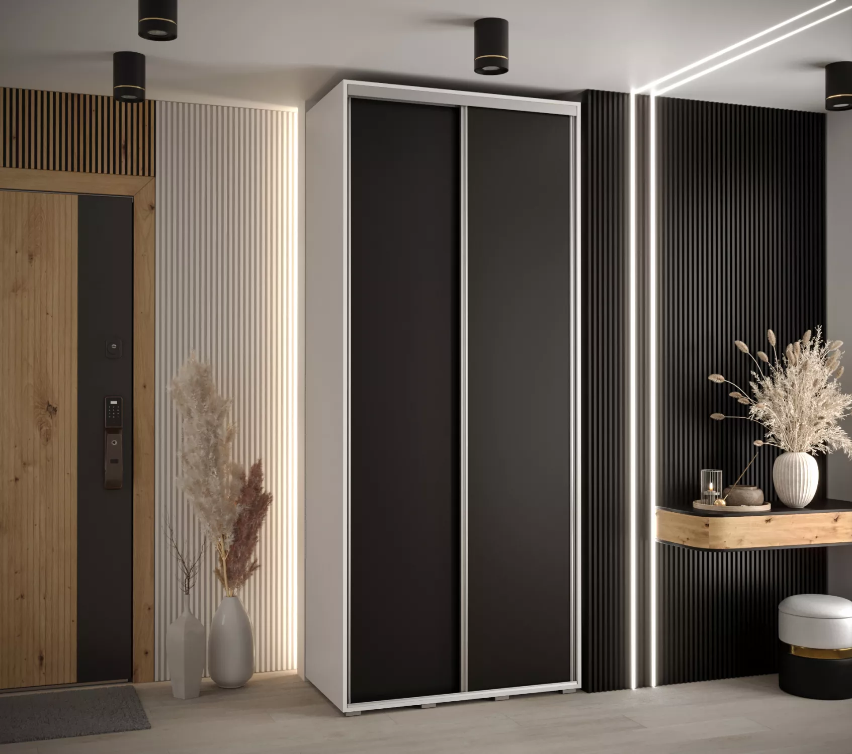 Úzká šatní skříň ASIRI zaujme svým moderním designem a praktickými prvky. Skříň má posuvné dveře, které se neotvírají do prostoru a ušetří tak spoustu místa. Vnitřek skříně lze uspořádat dle vašich potřeb.