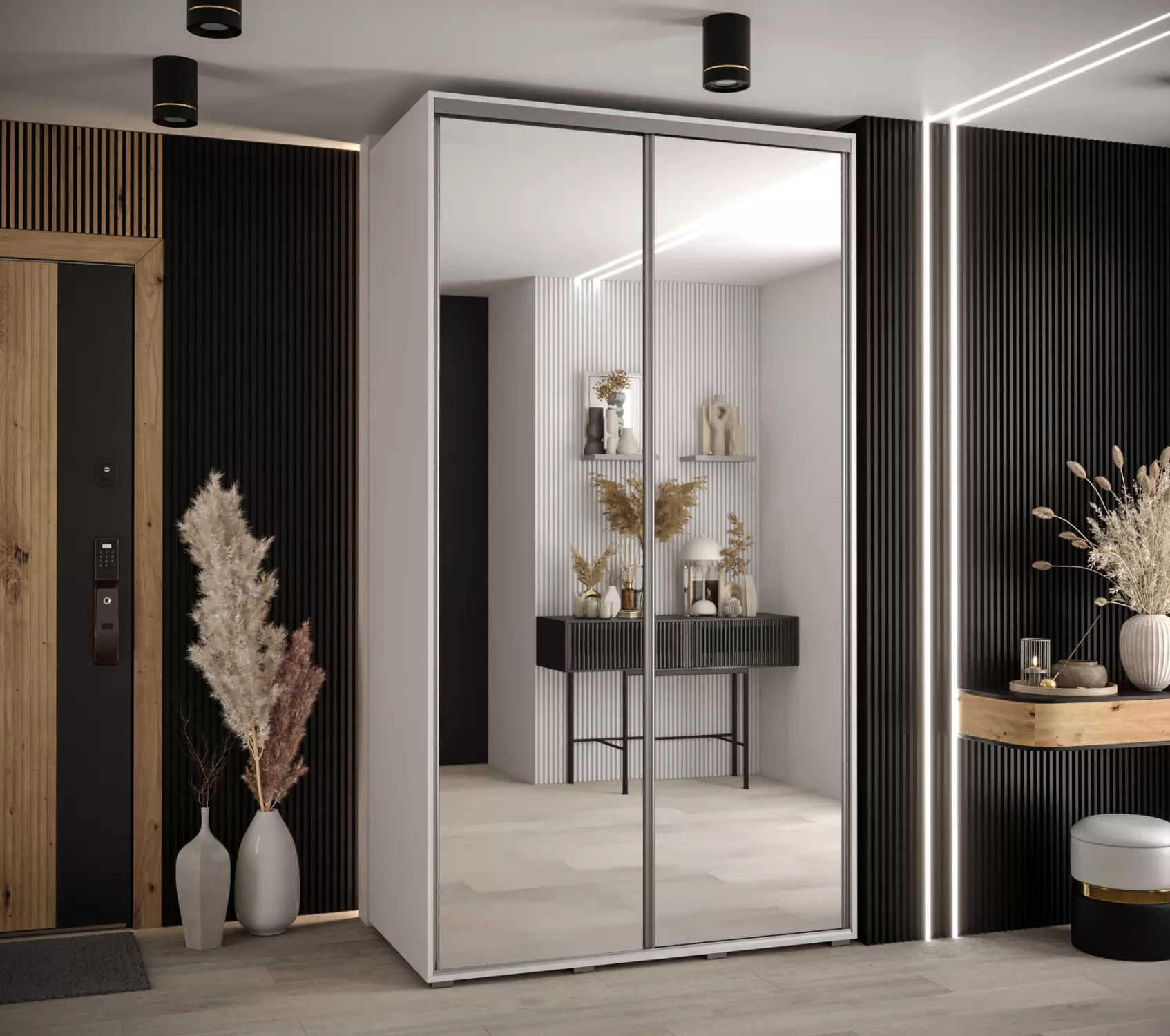 Šatní skříň se zrcadlem ASIRI zaujme svým moderním designem a praktickými prvky. Skříň má posuvné dveře, které se neotvírají do prostoru a ušetří tak spoustu místa. Vnitřek skříně lze uspořádat dle vašich potřeb.