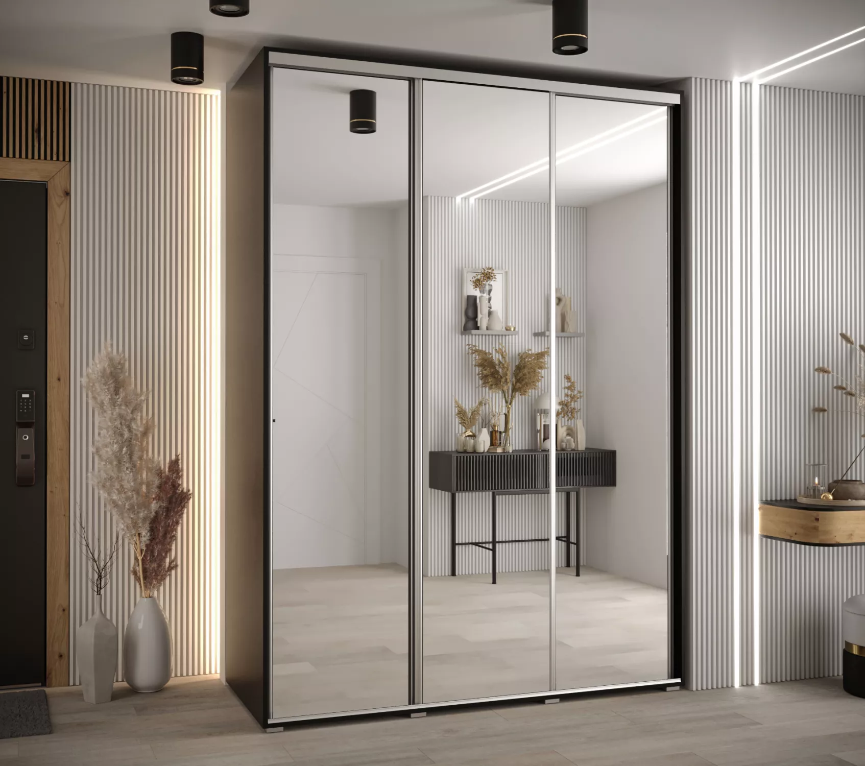 Vysoká šatní skříň se zrcadlem ASIRI zaujme svým moderním designem a praktickými prvky. Skříň má posuvné dveře, které se neotvírají do prostoru a ušetří tak spoustu místa. Vnitřek skříně lze uspořádat dle vašich potřeb.