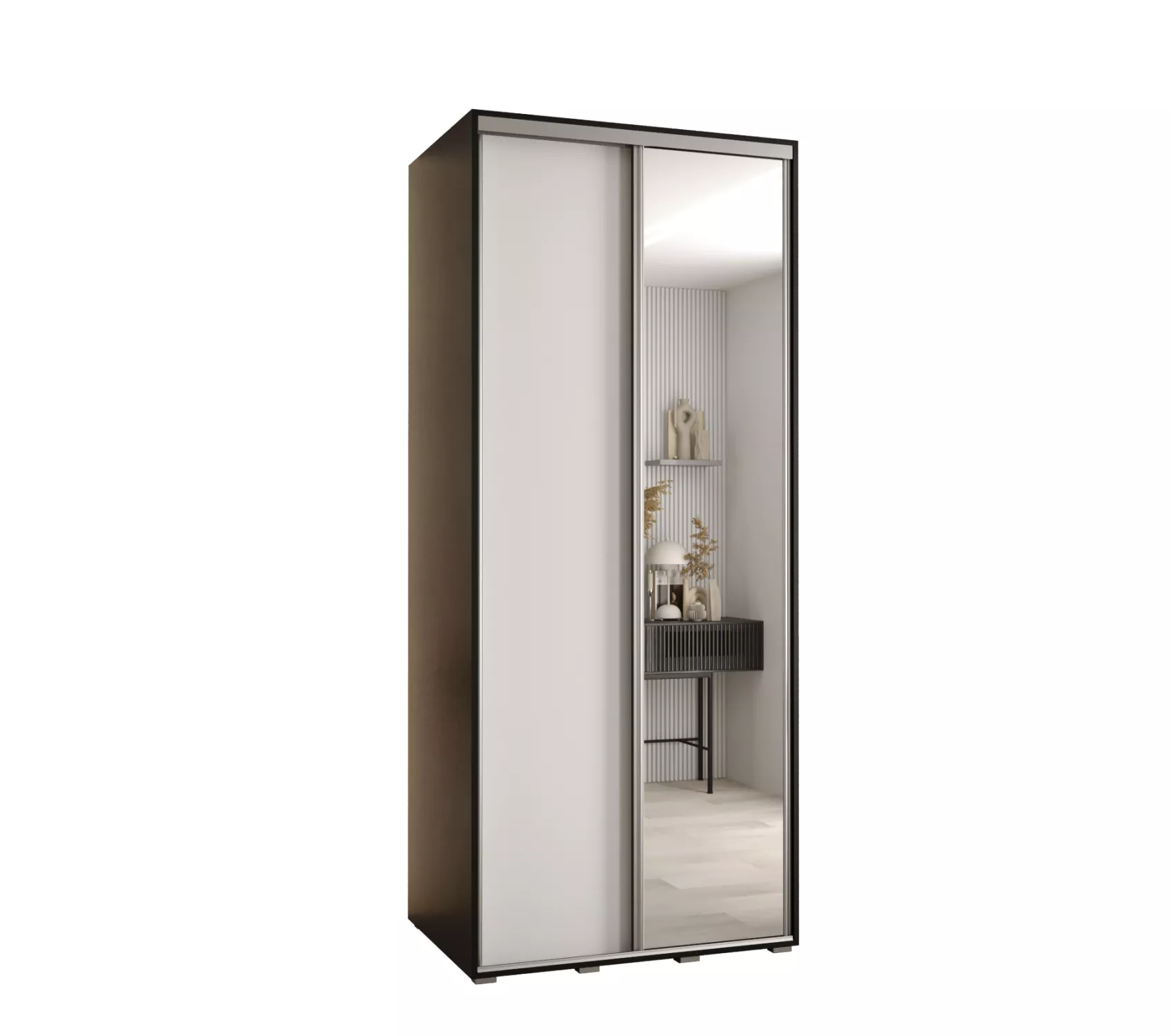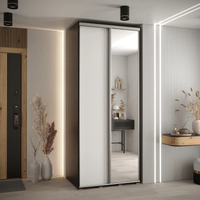 Úzká šatní skříň se zrcadlem ASIRI zaujme svým moderním designem a praktickými prvky. Skříň má posuvné dveře, které se neotvírají do prostoru a ušetří tak spoustu místa.