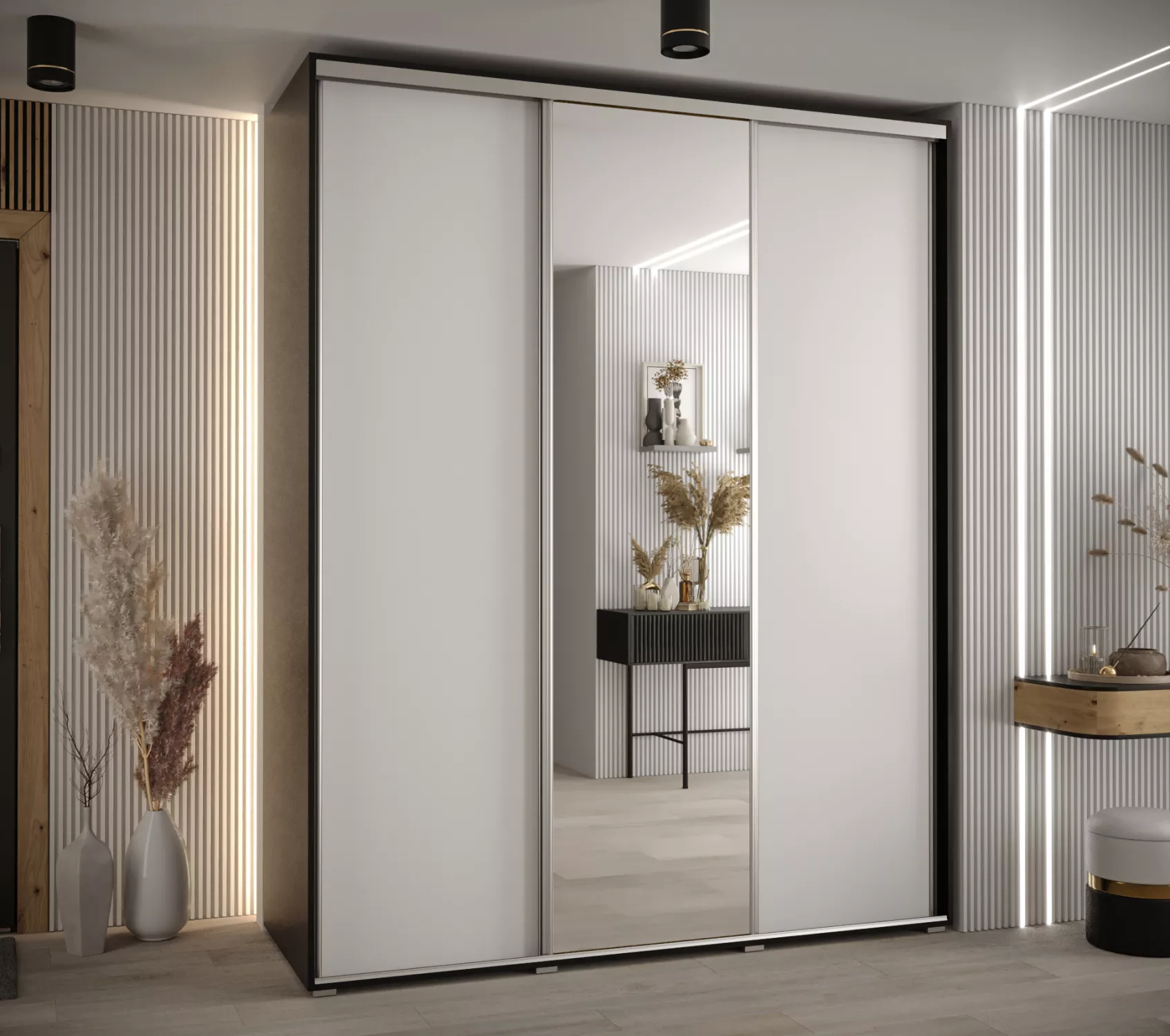 Šatní skříň ASIRI zaujme svým moderním designem a praktickými prvky. Šatní skříň má posuvné dveře, které se neotvírají do prostoru a ušetří tak spoustu místa.